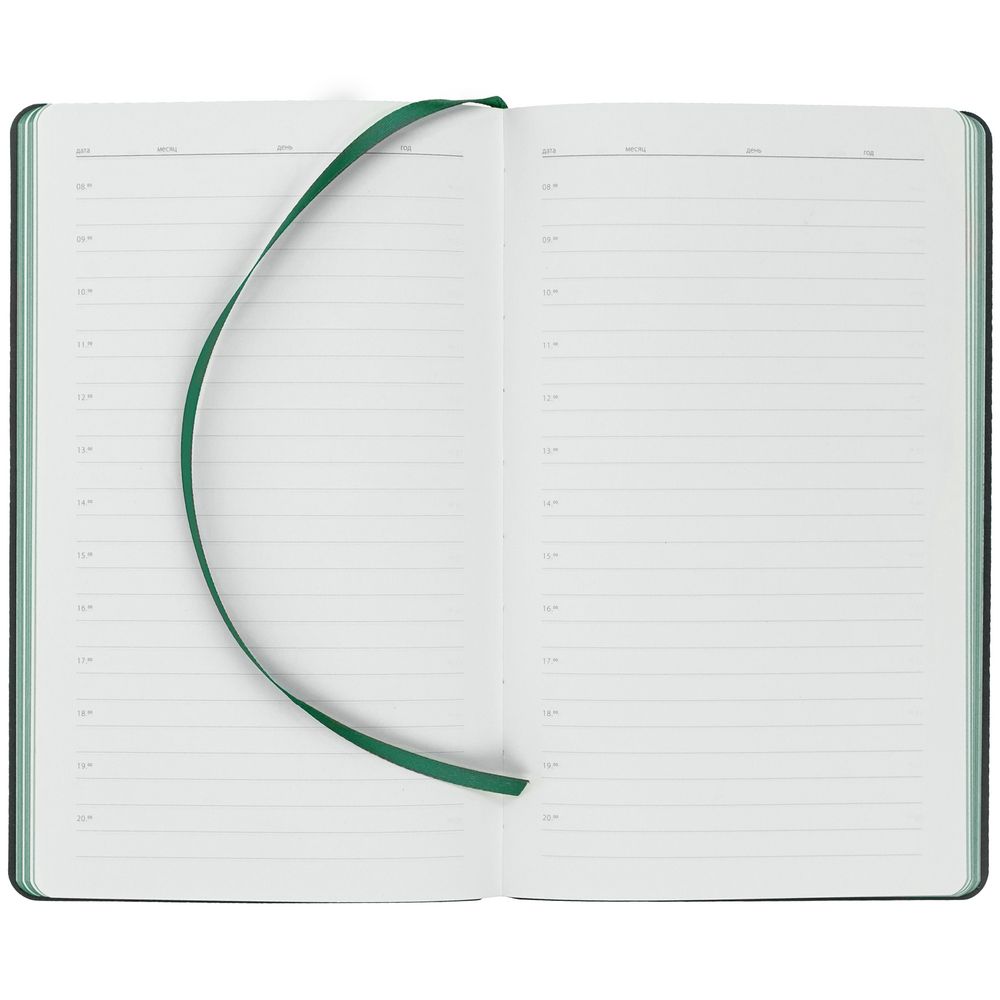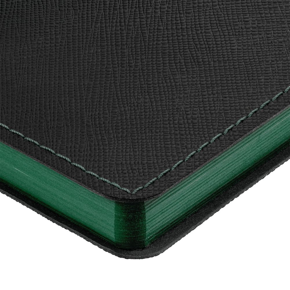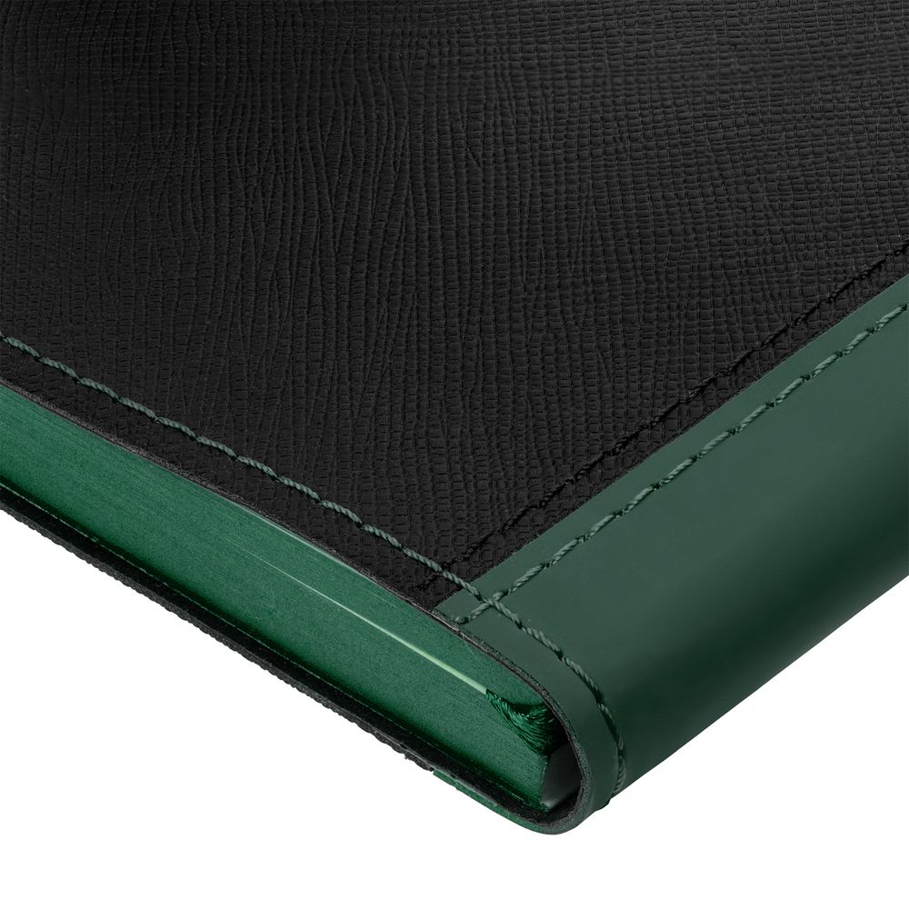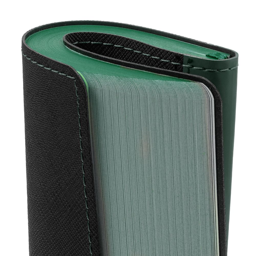 Ежедневник с гибкой обложкой выполнен из материала Nice Touch, черный АА и Soft Touch Ultra, зеленый FF, дополнен ляссе зеленого цвета.