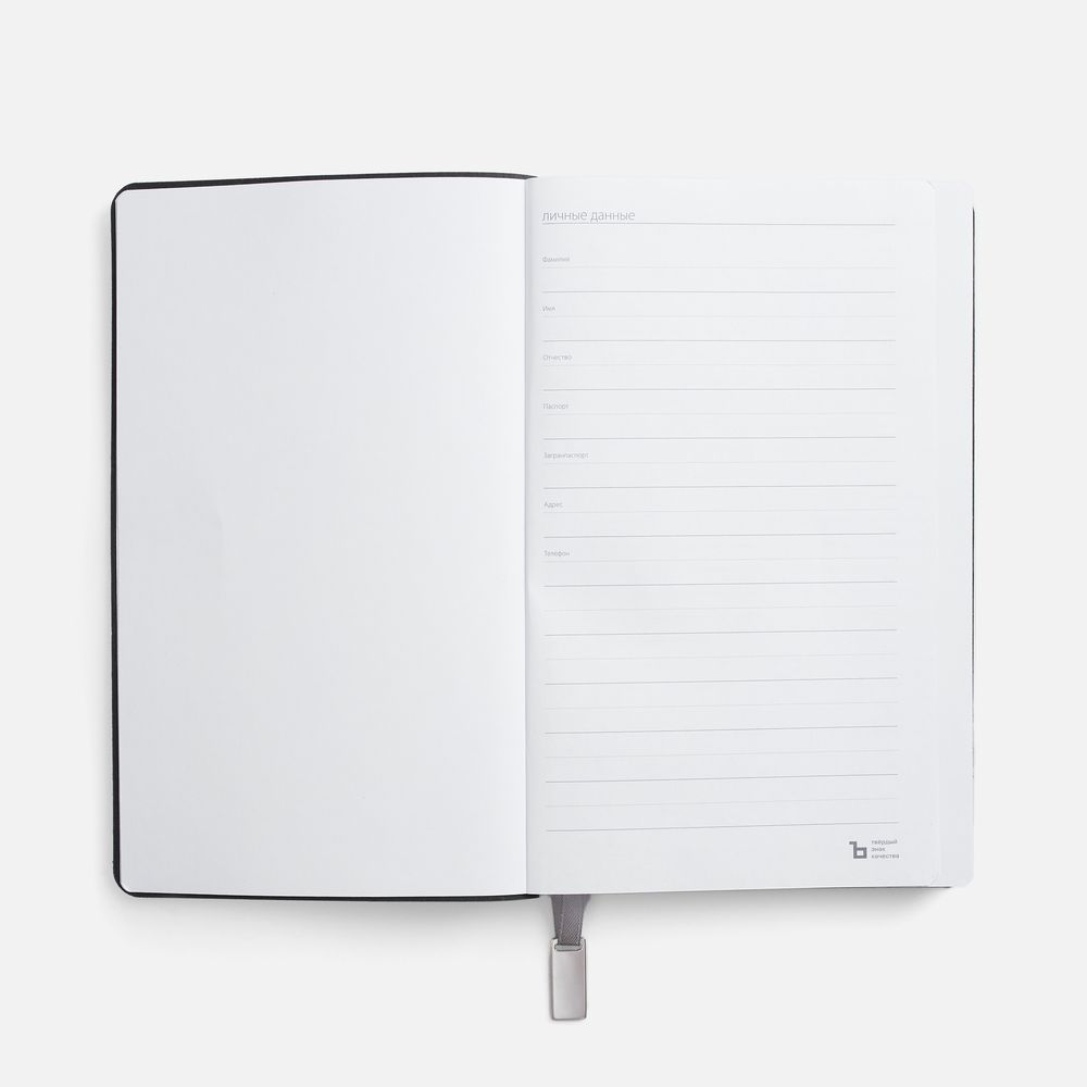 Ежедневник с гибкой обложкой, выполнен из материала Petrus, черный АА, дополнен серым ляссе с металлическим шильдиком.