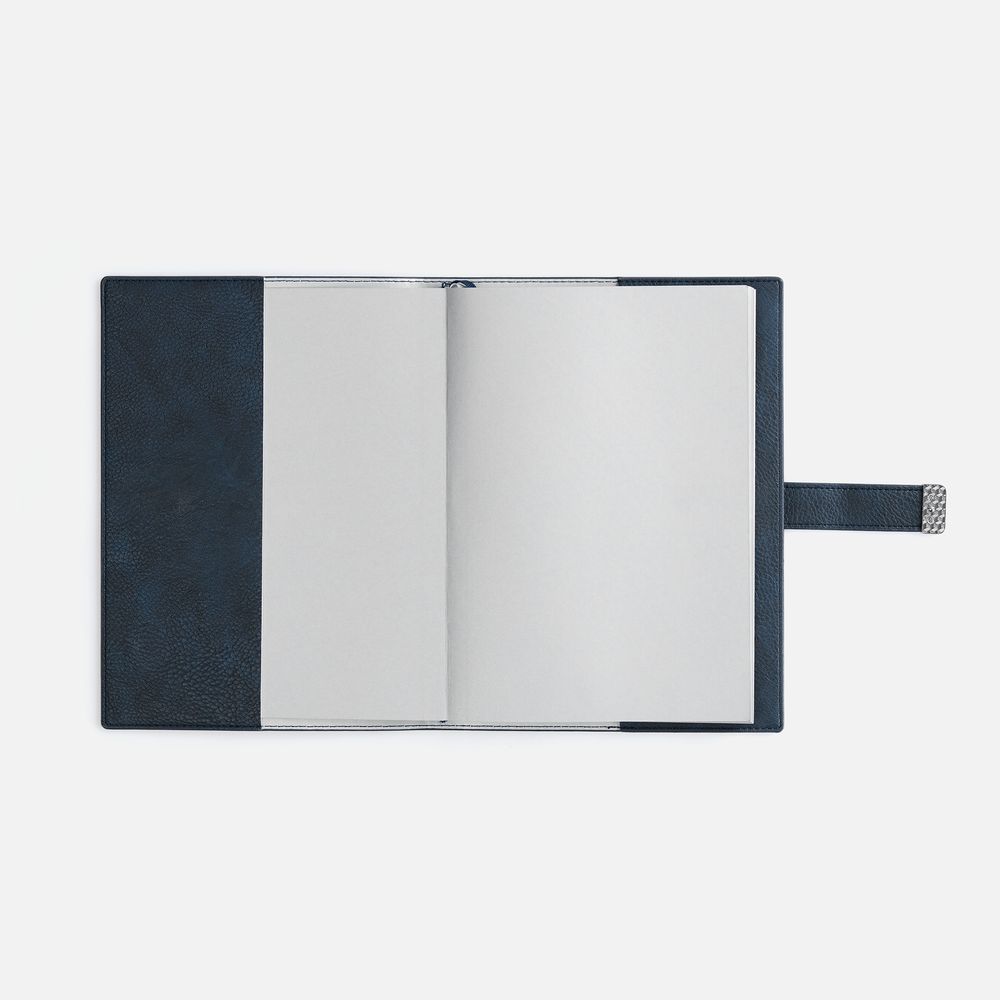 Ежедневник в мягком переплете со съемной обложкой, дополнен застежкой-хлястиком с металлическим шильдом на кнопке, двойным ляссе и капталом.