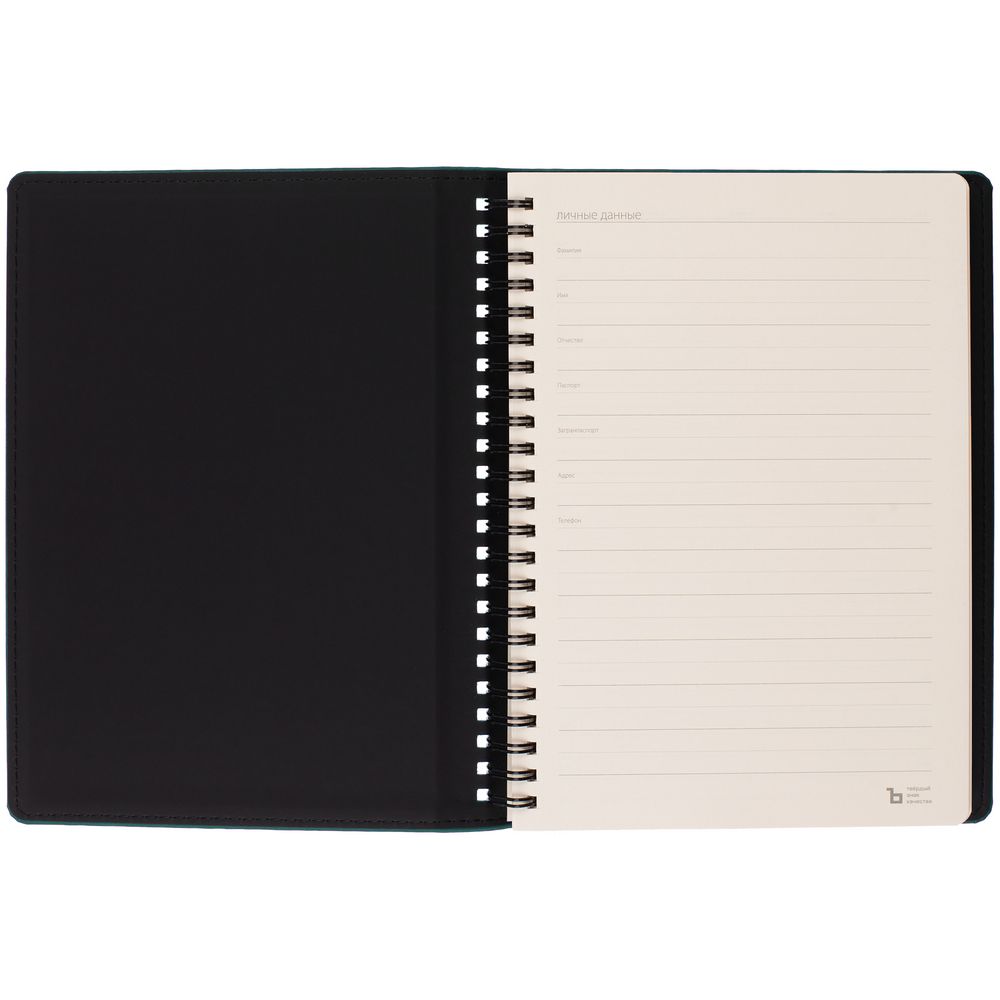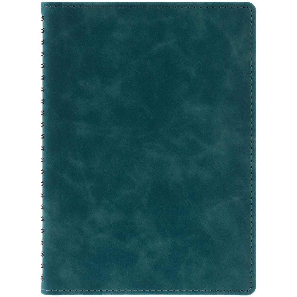 Ежедневник с блоком на пружине в твердой обложке, выполнен из материалов Nubuk Touch, зеленый FF и Soft Touch, черный AA.