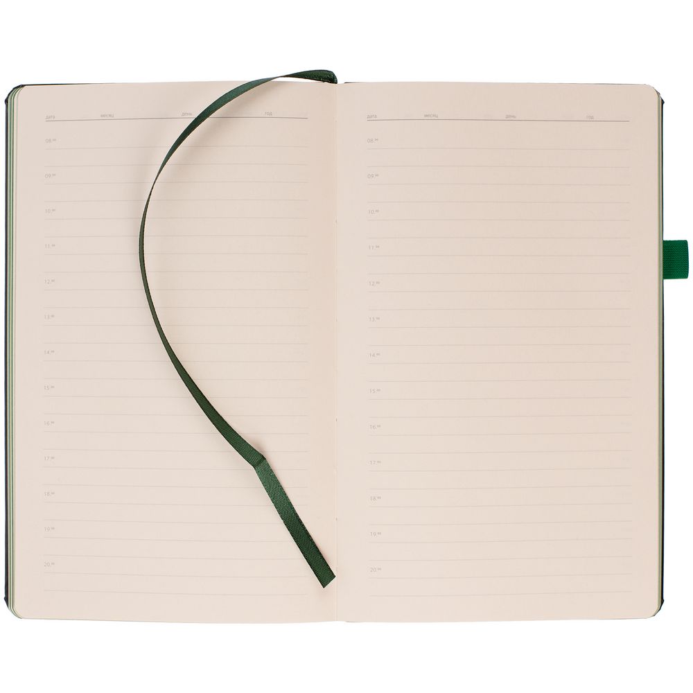 Ежедневник с полутвердой обложкой, выполнен из материала Waltz, черный АА, дополнен зеленой резинкой с металлическим шильдом и ляссе.