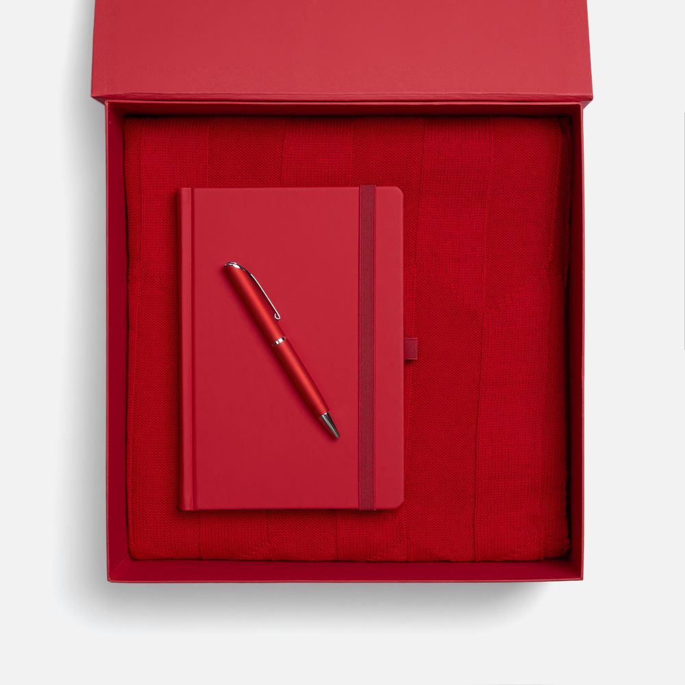 Однотонный набор с основной канцелярией и пледом — классика жанра в уютном исполнении. С компактным ежедневником будет удобно делать заметки в любое время — благодаря петельке для ручки любимый пишущий инструмент будет всегда под рукой. А изысканный акриловый плед с геометрическим узором позволит выразить самые теплые пожелания и ддобавит плавных линий в интерьер.