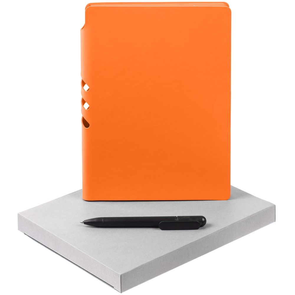 Удобный ежедневник с гибкой обложкой и местом под ручку в корешке, миниатюрная ручка из переработанного пластика и компактная самосборная коробка — простые составляющие полезного делового набора.