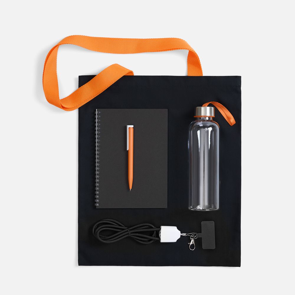блокнот - бумага, картон, бумага, бутылка - пластик, пищевой, кабель-ланьярд - нейлон, пластик, крышка - металл, пластик, металл, нейлон, пластик, ручка - пластик, ручки - полиэстер, сумка - хлопок, 240 г/м², хлопок