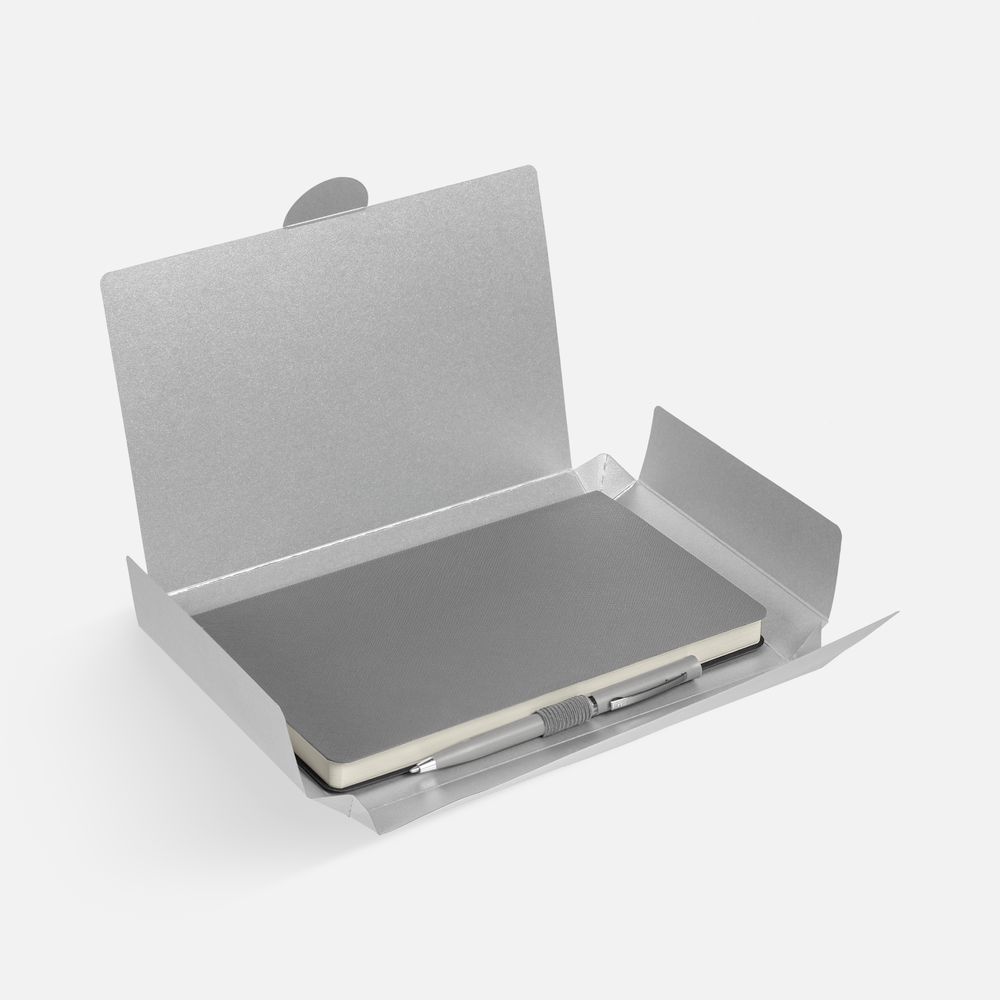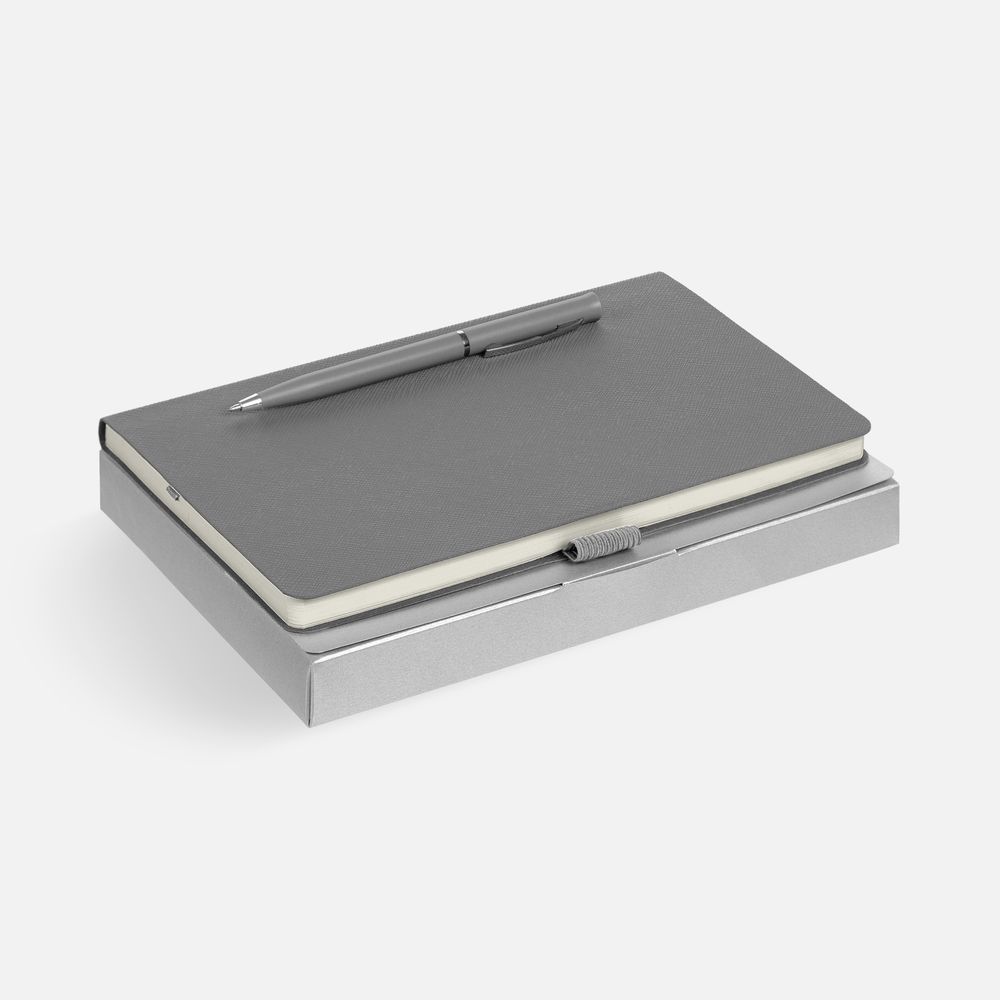 Зауженный ежедневник и ручка комплементарного оттенка в простой лаконичной коробке — готовое предложение делового подарка для сотрудников и партнеров.