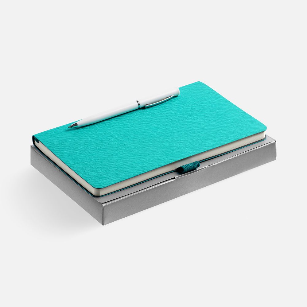 Зауженный ежедневник и ручка комплементарного оттенка в простой лаконичной коробке — готовое предложение делового подарка для сотрудников и партнеров.