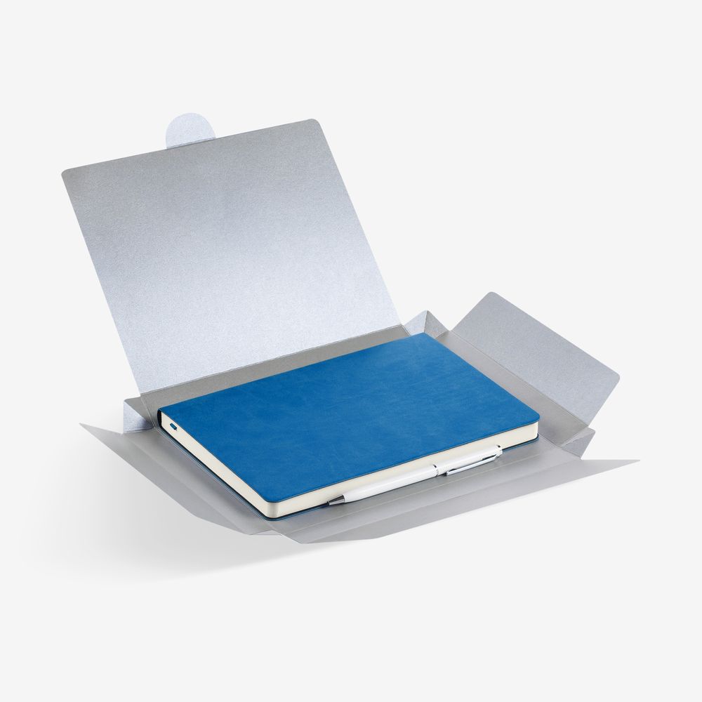 Недатированный ежедневник с гибкой обложкой из материала Latte с ляссе в цвет обложки, а также ручка в тон — в подарочной коробке из дизайнерского картона.