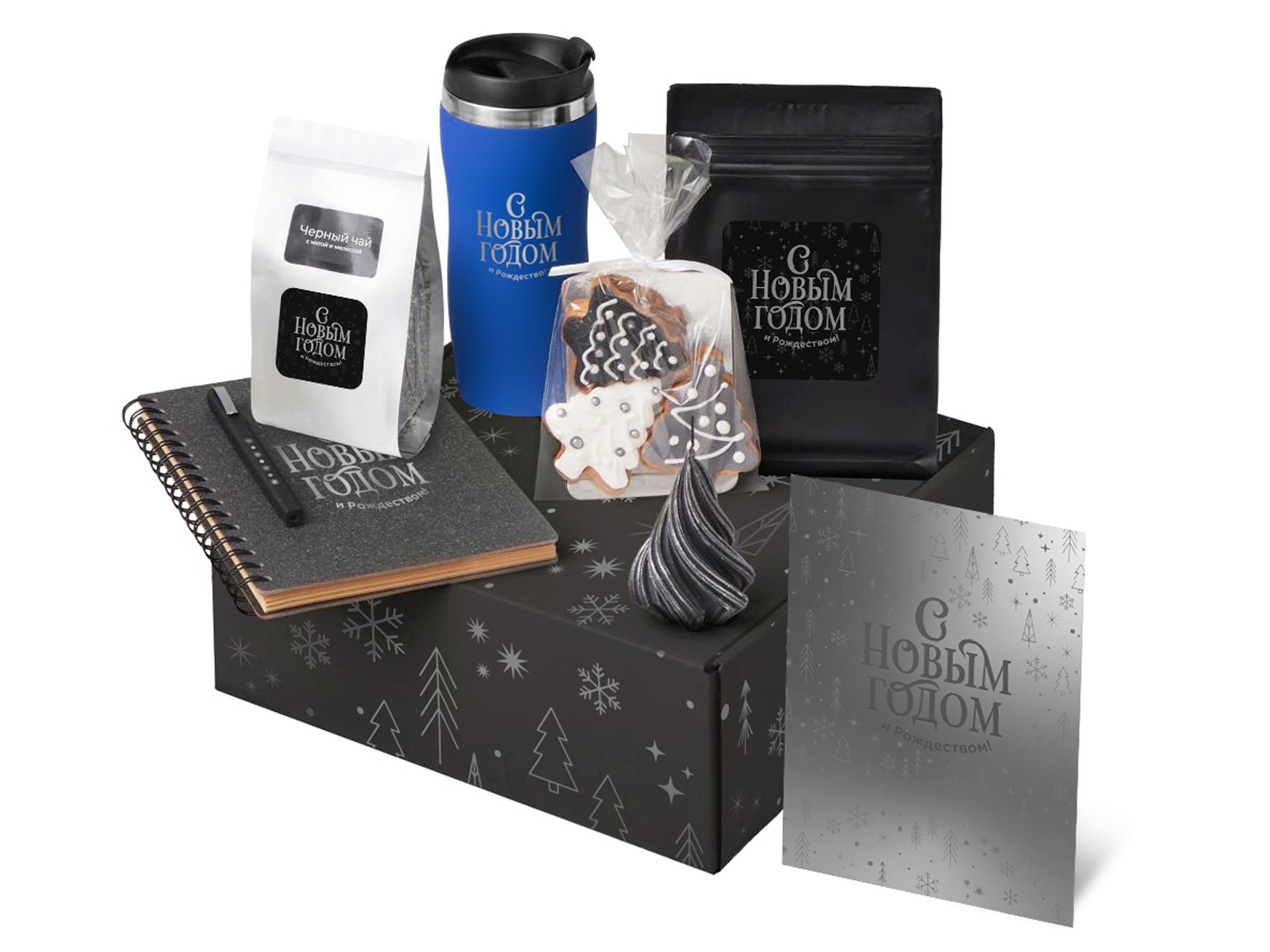 Подарочный набор c термокружкой, чаем, кофе и блокнотом, синий