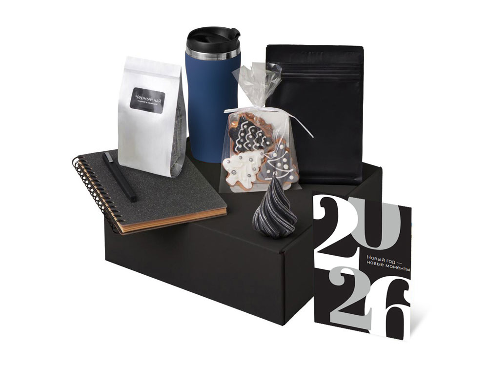 Подарочный набор c термокружкой, чаем, кофе и блокнотом, темно-синий