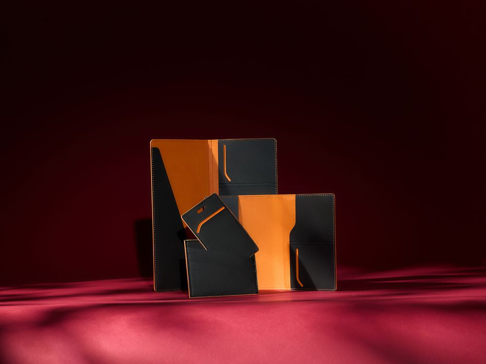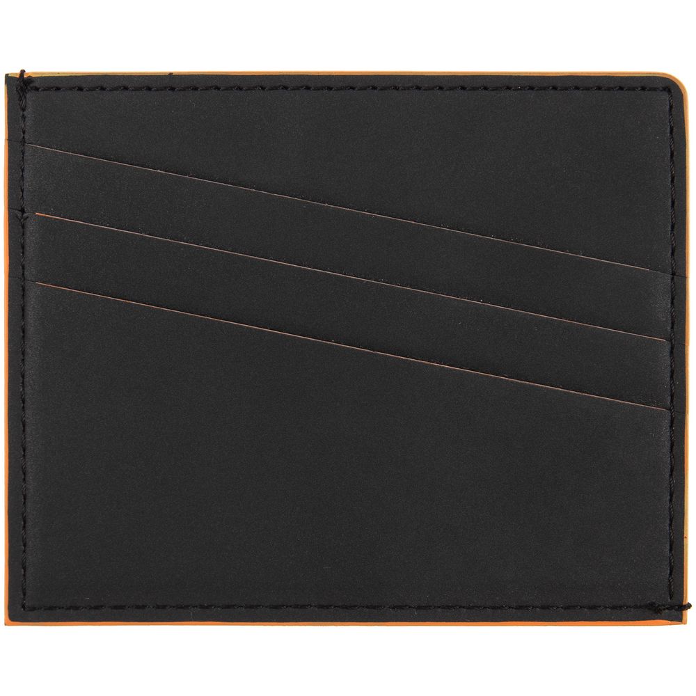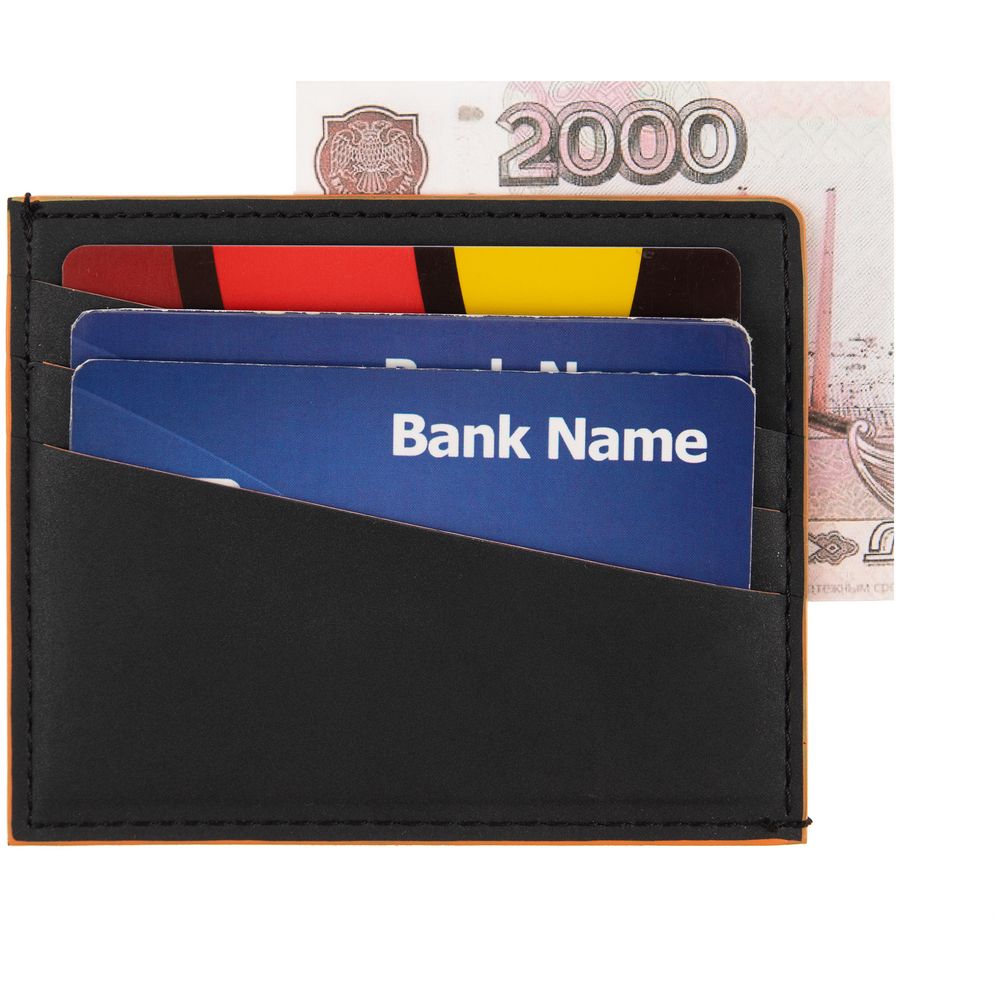 Чехол выполнен из материала Soft Touch Pearl, черный АА, дополнен окрашенным срезом края и внутренним карманом из цветного картона. Имеет 4 отделения для кредитных карт и 1 отделение для купюр.