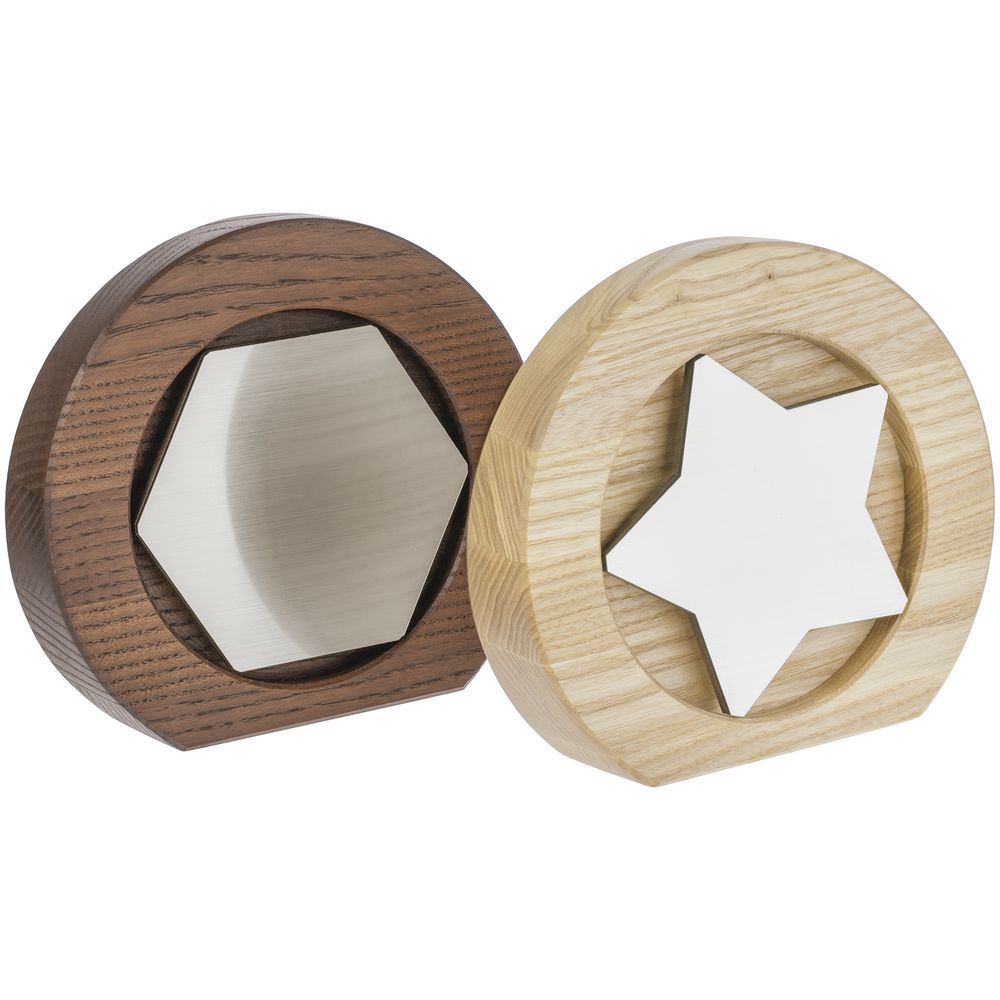 Вставка с шестигранником из зеркального пластика на деревянной основе крепится на приподнятое основание внутри стелы, что создает объем и многослойность награды. На вставке предусмотрен клеевой слой для крепления после нанесения.