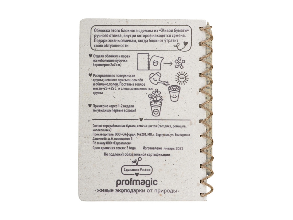 Живой Блокнот - это блокнот ручной работы с семенами цветов внутри обложки. Блок на 50 листов сделан из экологичной неотбеленной бумаги, вместо пружины используется льняной шпагат. Блокнот поставляется с бумажным карандашом в наборе. После использования блокнота, вырвите обложку, порвите ее на кусочки и посадите в землю. Поливайте, и уже через несколько недель вы увидите первые всходы.