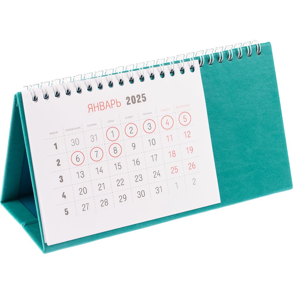 Настольный, перекидной календарь-домик выполнен из материала Latte, голубой JJ.