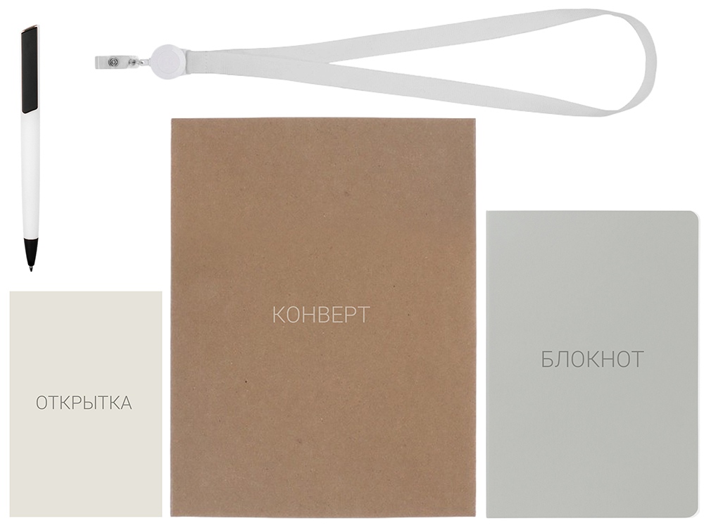 блокнот - искусственная кожа, открытка - бумага, пакет - картон, ручка - пластик с покрытием soft-touch, ланьярд с ретрактором - полиэстер, металл, пластик.