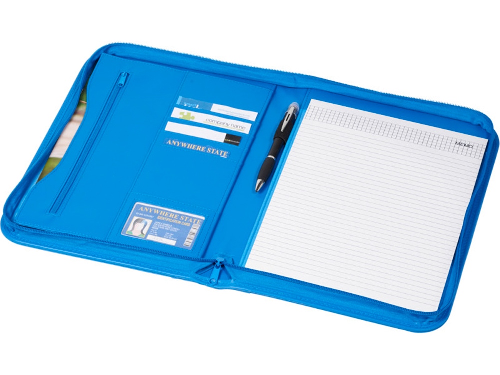 Папка с застежкой-молнией, держателем для пучки, карманом на молнии, отделениями для документов и блокнотом А4 с 20 страницами линованной бумаги. Ручка и принадлежности не включены.