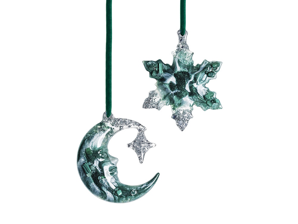 Набор из 2-х елочных игрушек: в форме месяца и снежинки. Игрушки выполнены из ювелирной эпоксидной смолы и украшены галтовкой из натуральных минералов.