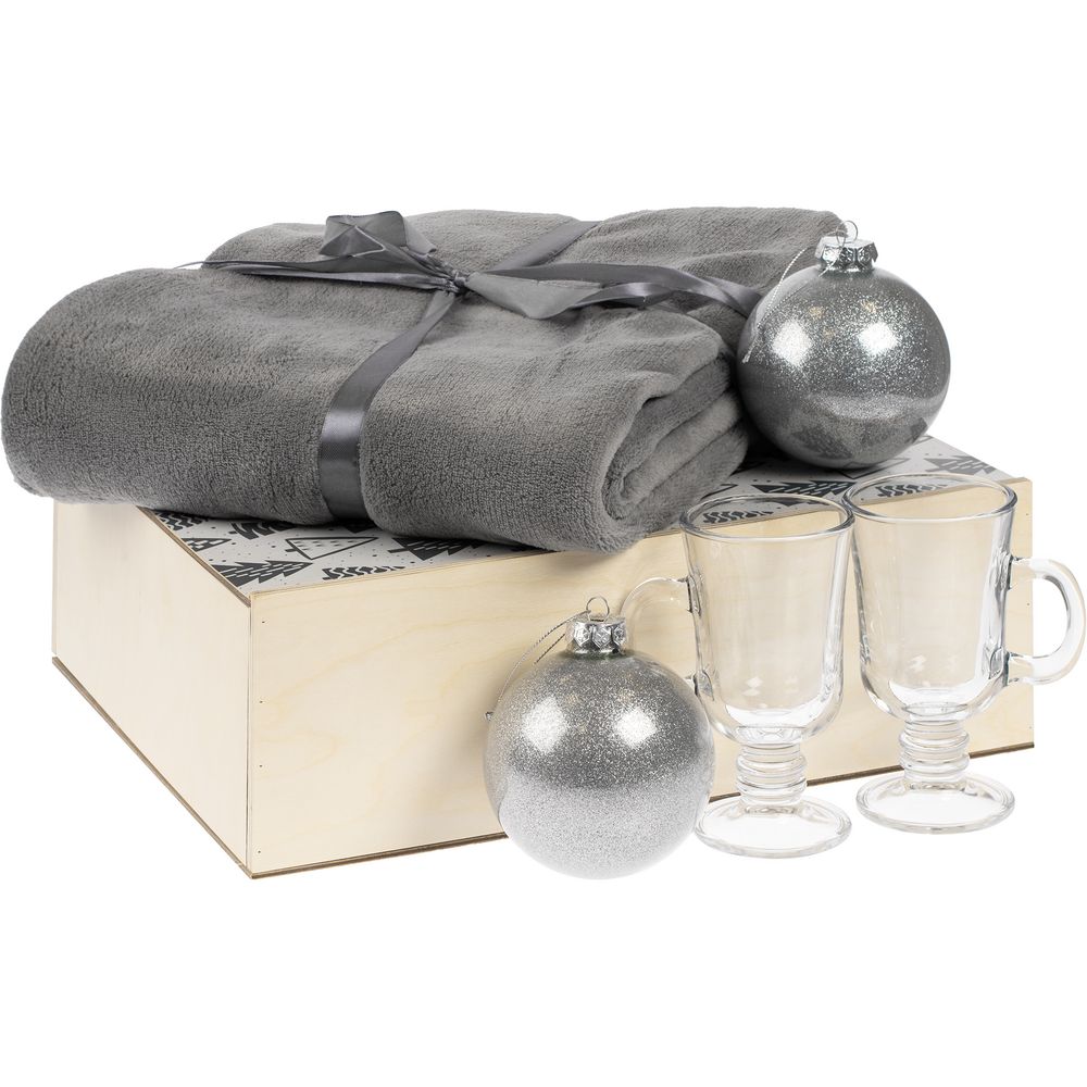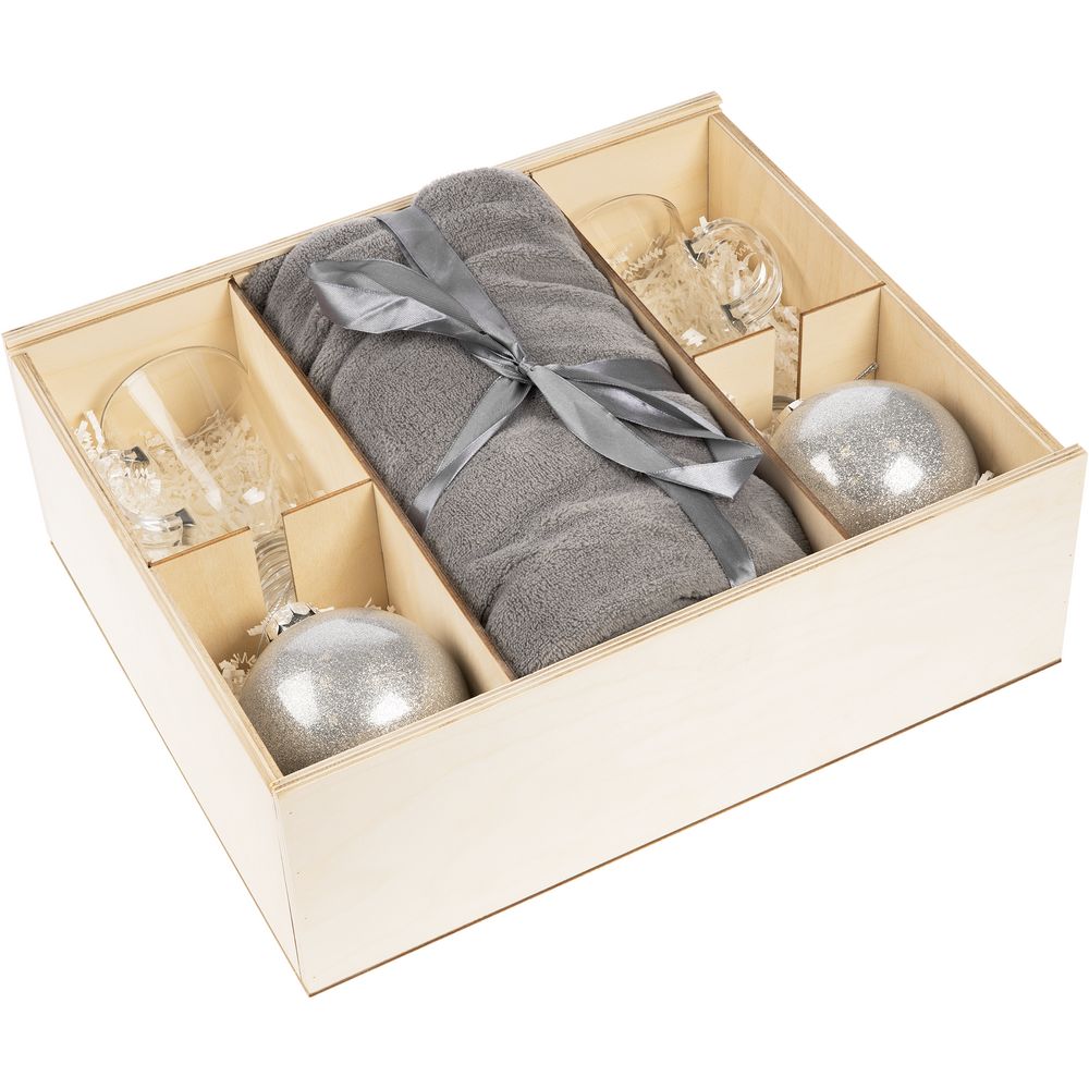 дерево, коробка - дерево, фанера, кружка, елочный шар - стекло, плед - полиэстер 100%, полиэстер 100%, стекло