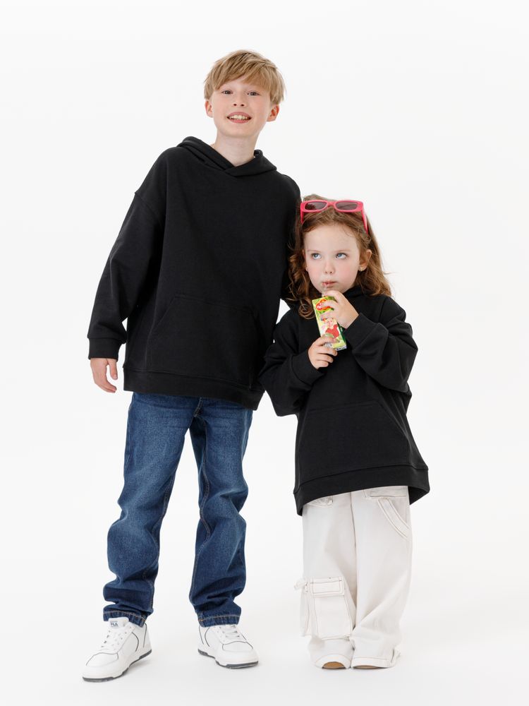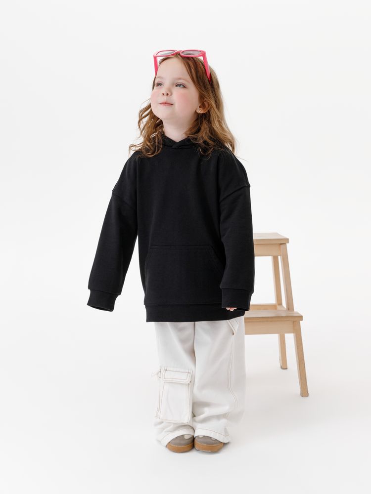 Детское худи оверсайз со спущенным плечом и карманом-кенгуру.