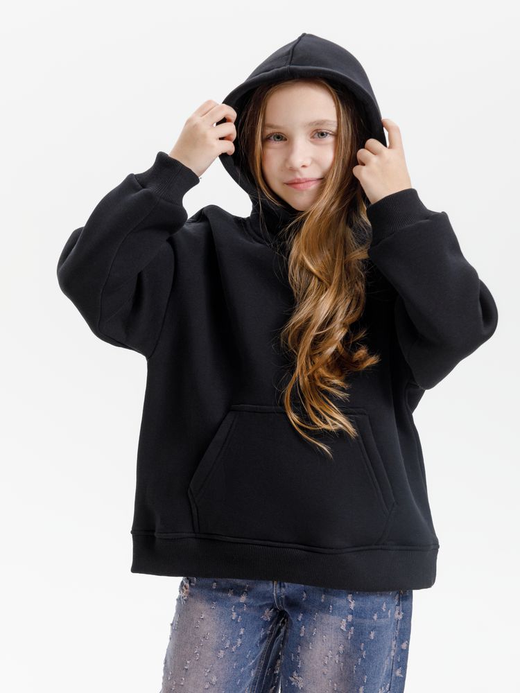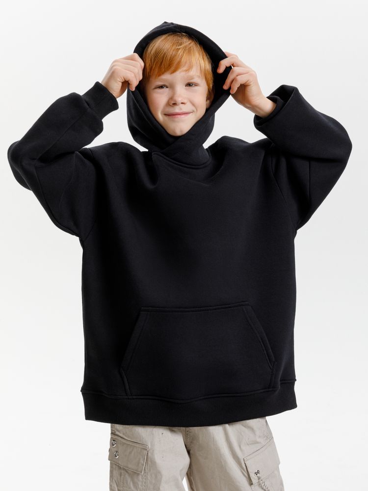Детское худи унисекс со спущенным плечом и карманом-кенгуру.