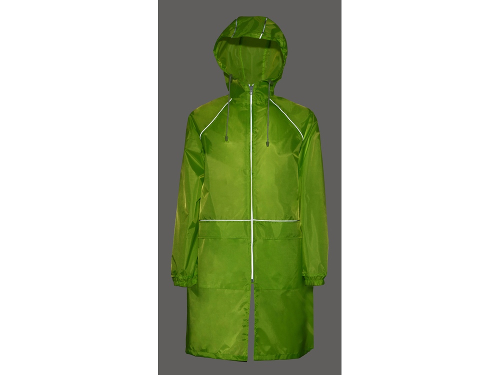 Плащ-дождевик прямого силуэта с капюшоном и рукавом реглан. Застегивается на центральную молнию со светоотражающей полосой с внутренней ветрозащитной планкой. Накладные карманами с клапанами. Двухшовный капюшон с кулиской по краю. Низ рукавов обработан манжетами с внутренней резинкой для комфортной посадке в области запястья. Верхний край клапана кармана, швы капюшона, а также регланные линии обработаны светоотражающим кантом.