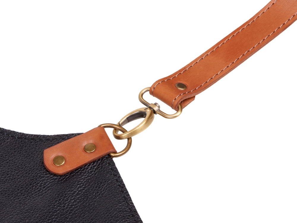- Стильные акценты: Ремни светлого бука не только удобно фиксируют фартук, но и добавляют контраста черному цвету, делая его настоящим модным заявлением.