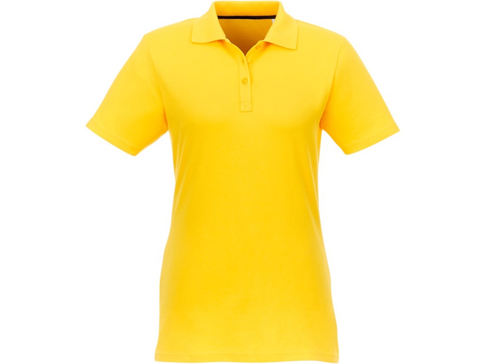 Женское поло Helios с коротким рукавом. Женская модель с разрезами по бокам. Отрезной-отрывной ярлык для комфорта. Воротник гладкой вязкой в рубчик. Планка с тремя пуговицами. Двойная строчка на воротнике и внизу изделия. Пуговицы в цвет изделия. Полоска на горловине в контрастном цвете. Трикотаж Piqué, 100 % хлопок. 180 г/м².
