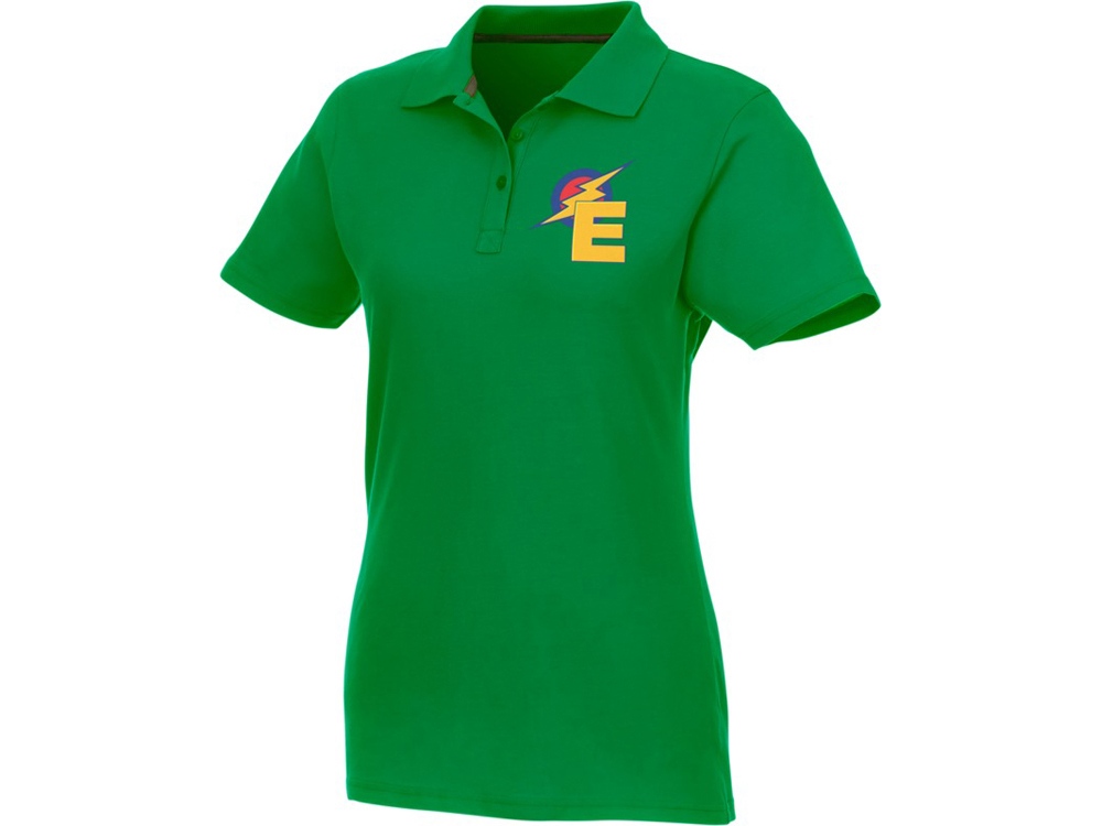 Женское поло Helios с коротким рукавом. Женская модель с разрезами по бокам. Отрезной-отрывной ярлык для комфорта. Воротник гладкой вязкой в рубчик. Планка с тремя пуговицами. Двойная строчка на воротнике и внизу изделия. Пуговицы в цвет изделия. Полоска на горловине в контрастном цвете. Трикотаж Piqué, 100 % хлопок. 180 г/м².
