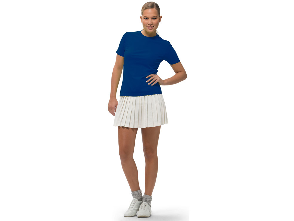 Женская футболка с короткими рукавами Ace. Модель стандартной посадки. Женская и детская модели - со швами по бокам. Резинка с эластаном и двойной строчкой на воротнике. Лента от плеча к плечу. Однослойная джерси, 100% хлопок. 150 г/м².