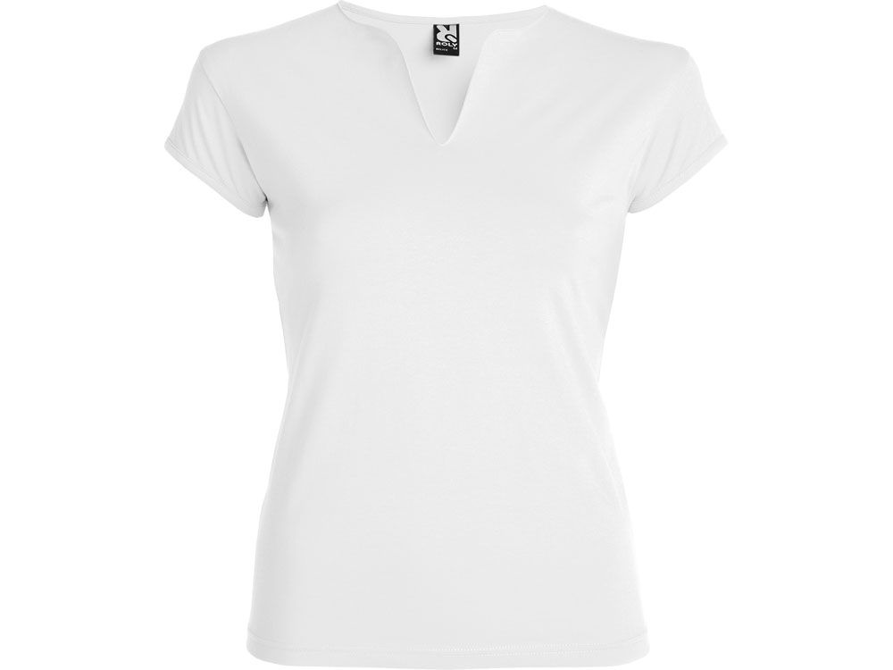 Приталенная женская футболка с круглым вырезом и v-образным разрезом спереди. Двойная отстрочка по рукавам и низу изделия.