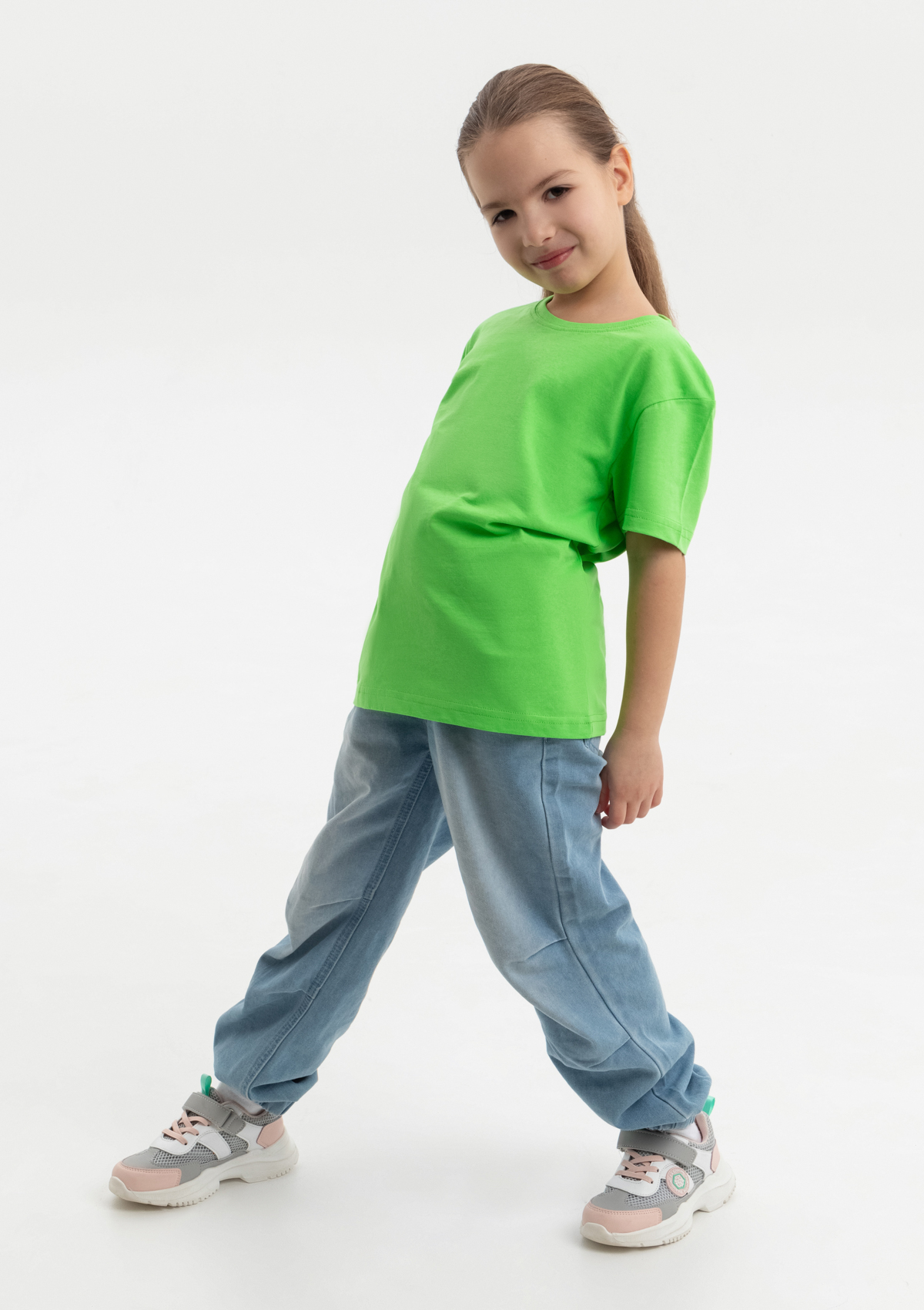Детская футболка свободного силуэта с округлым воротом и втачным рукавом. Плечевые швы и шов горловины спинки усилены настрочной бейкой из основного полотна.