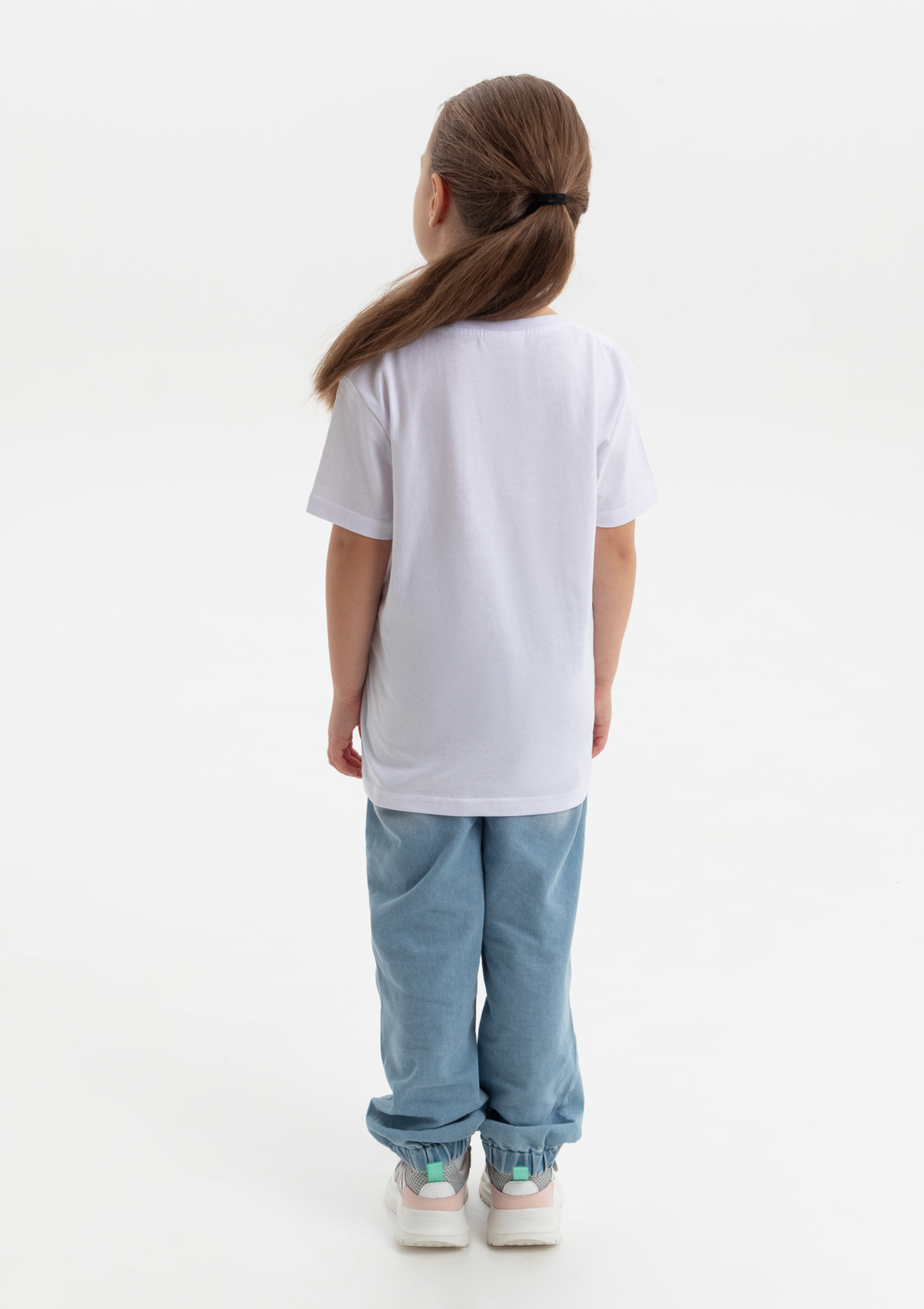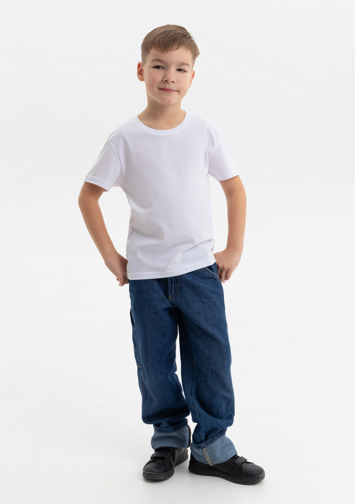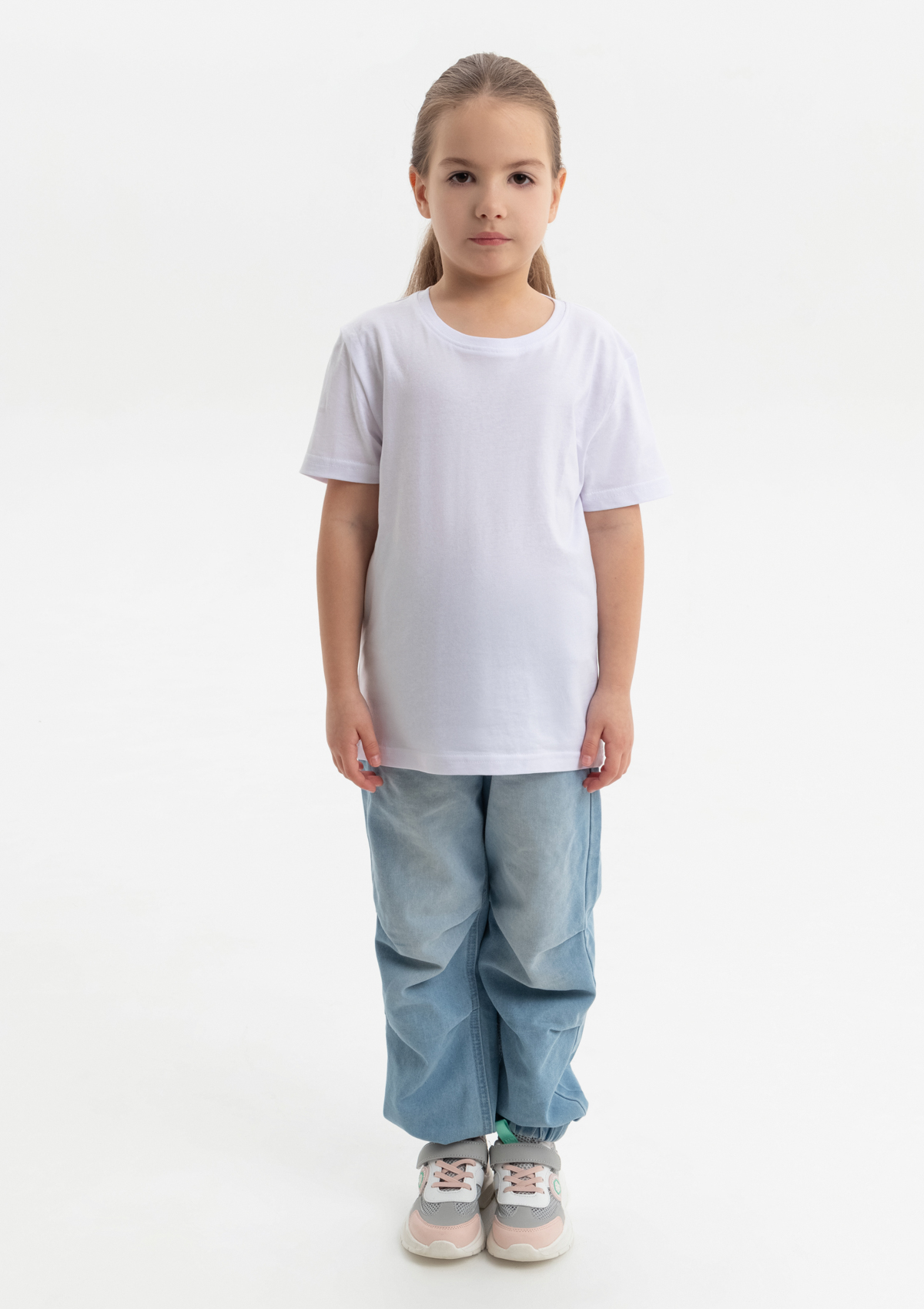 Детская футболка свободного силуэта с округлым воротом и втачным рукавом. Плечевые швы и шов горловины спинки усилены настрочной бейкой из основного полотна.