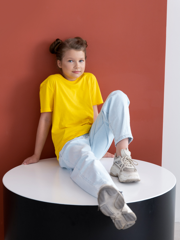 Детская футболка свободного силуэта с округлым воротом и втачным рукавом. Плечевые швы и шов горловины спинки усилены настрочной бейкой из основного полотна.