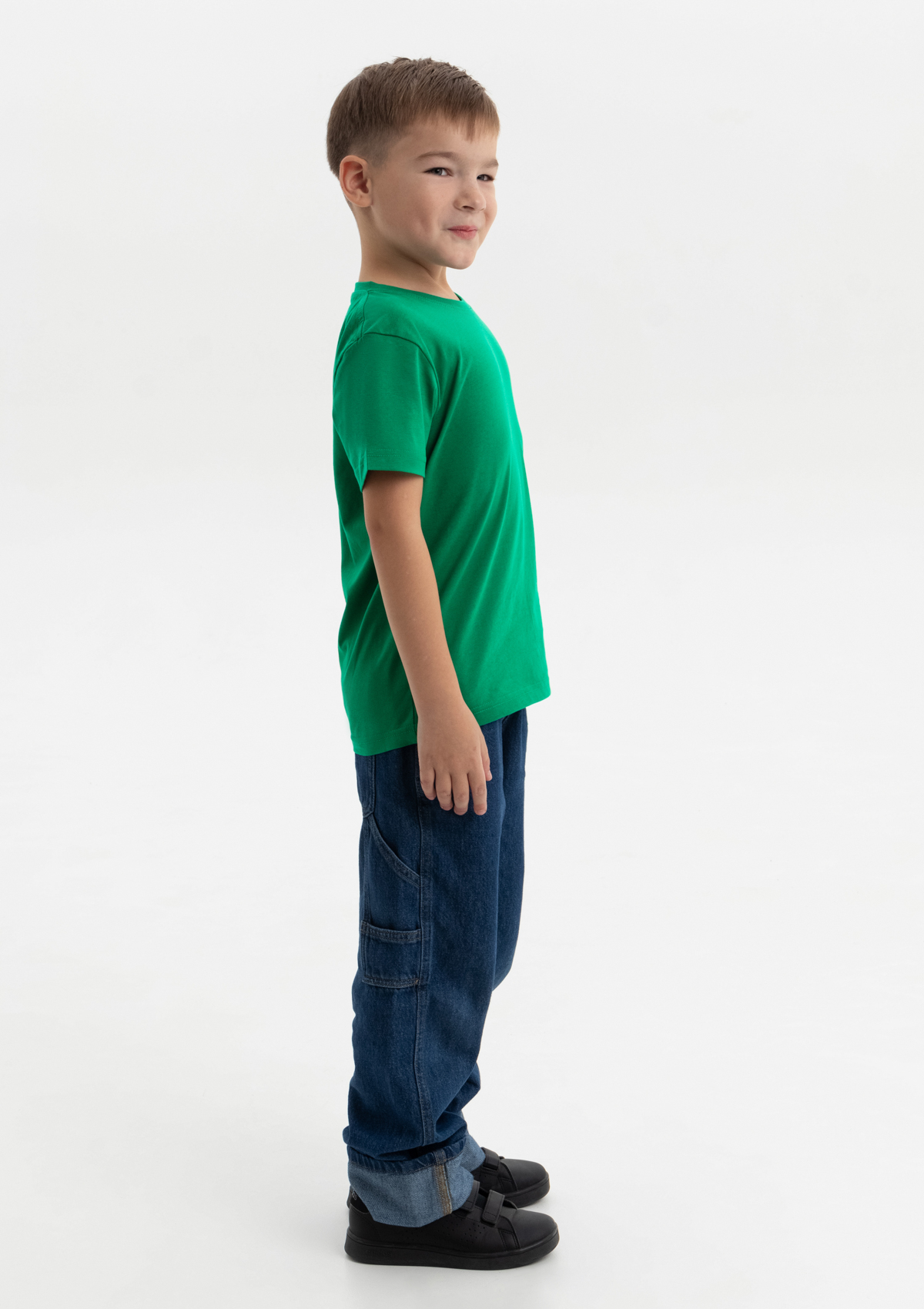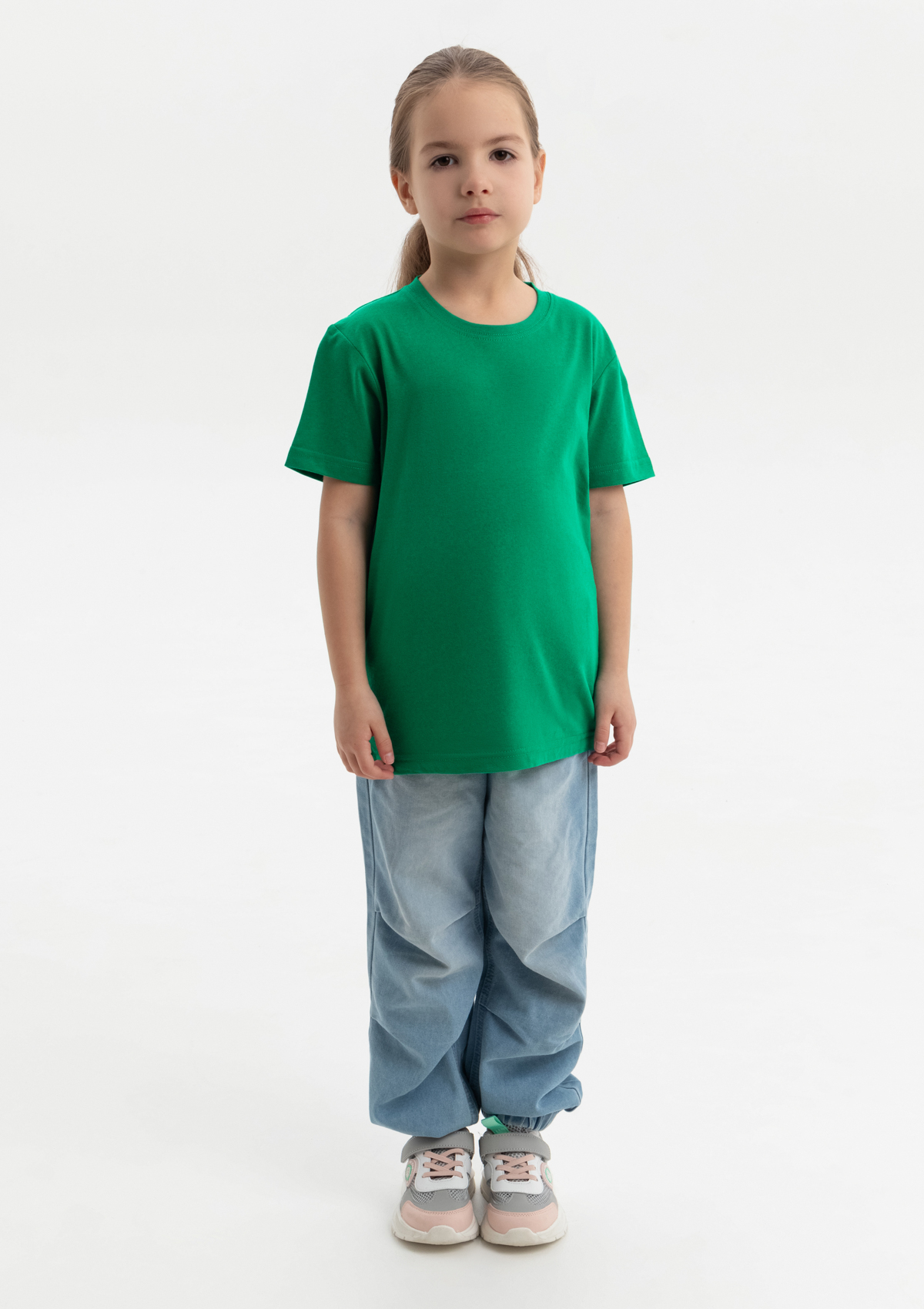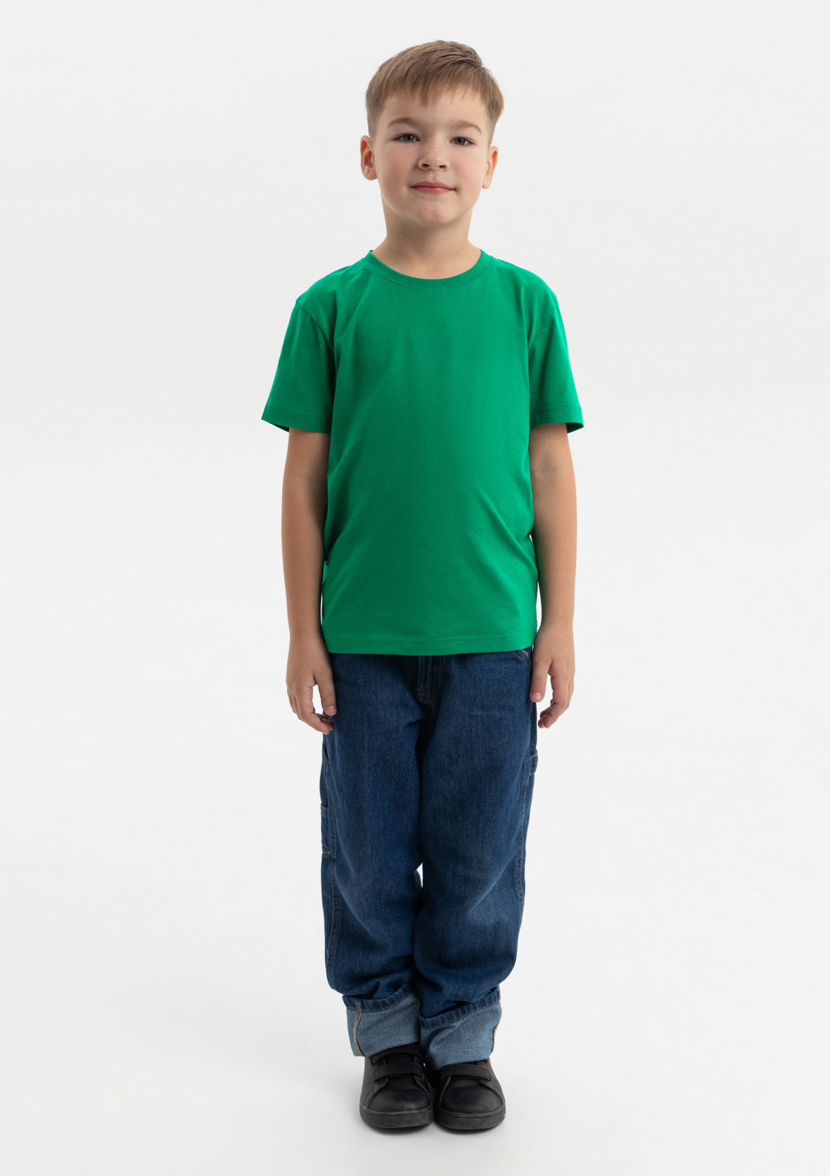 Детская футболка свободного силуэта с округлым воротом и втачным рукавом. Плечевые швы и шов горловины спинки усилены настрочной бейкой из основного полотна.