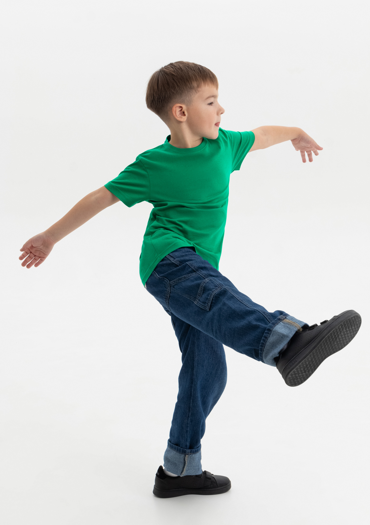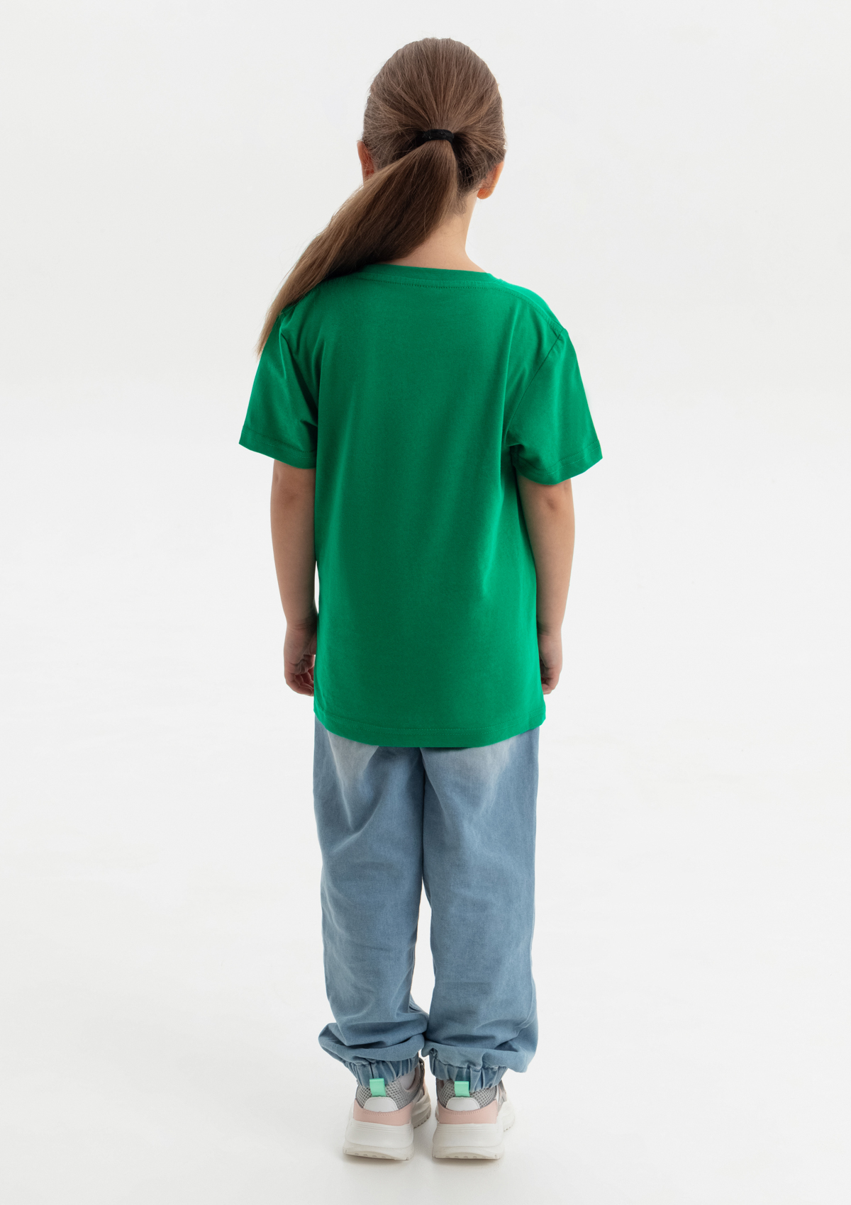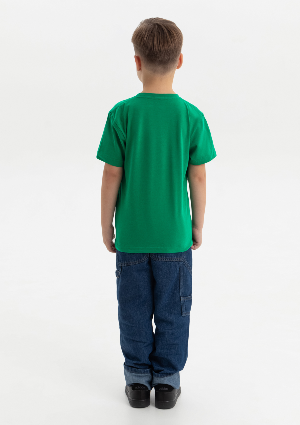Детская футболка свободного силуэта с округлым воротом и втачным рукавом. Плечевые швы и шов горловины спинки усилены настрочной бейкой из основного полотна.