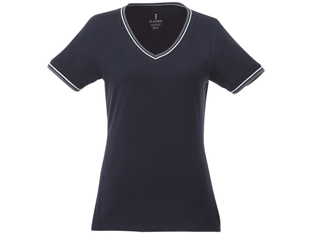 Женская футболка Elbert с коротким рукавом. Воротник гладкой вязкой в рубчик. Манжеты гладкой вязкой в рубчик. Контрастные окантовки.V-образная горловина. Двойная строчка на воротнике и внизу изделия. Комфортный ярлык-трансфер на изделии. Трикотажное пике, 100% хлопок. 180 г/м².