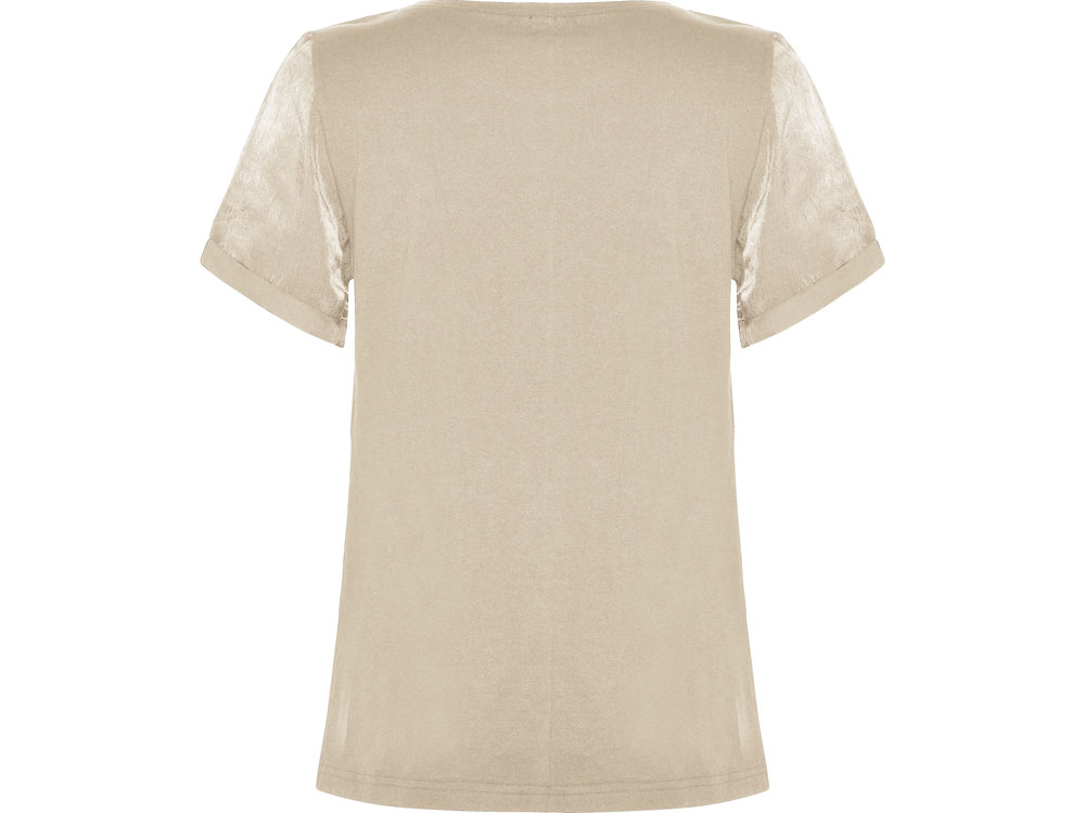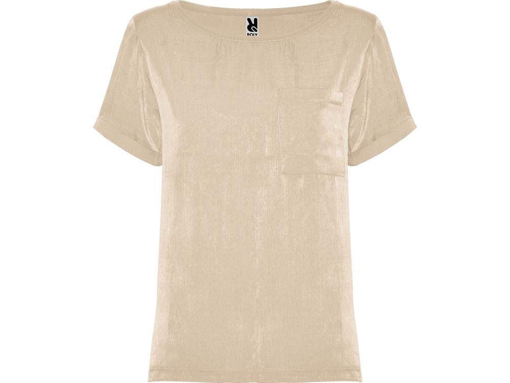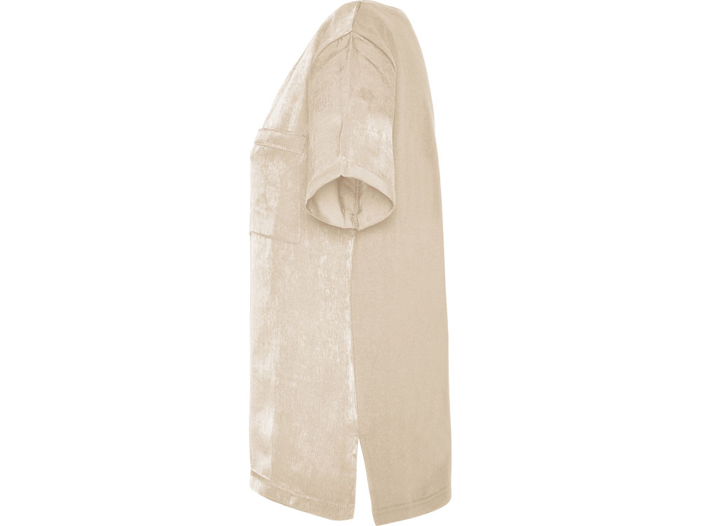 Женская футболка с коротким рукавом с расширенной горловиной. Накладной карман на груди слева. Спинка длиннее полочки. Разрезы в боковых швах.