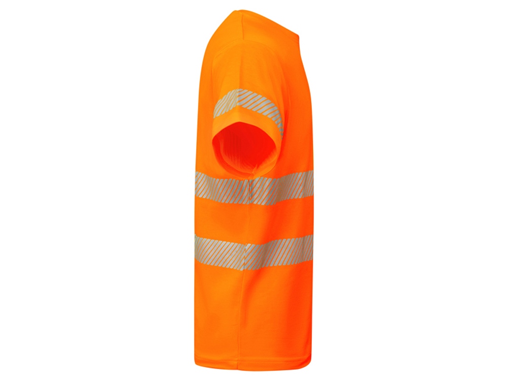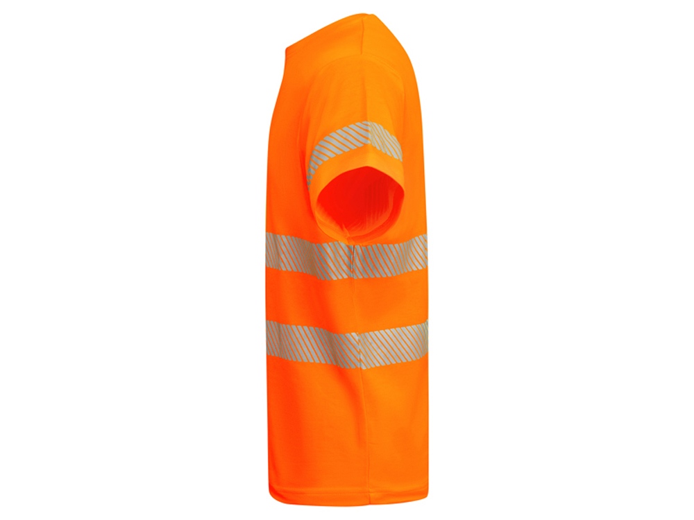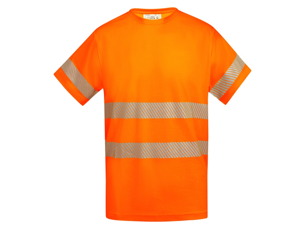 Мужская футболка с коротким рукавом с круглым вырезом под горло из основной ткани. Две светоотражающие сегментированные полосы на груди и одна на рукавах. Микс полиэстера и хлопка для повышенной воздухопроницаемости.