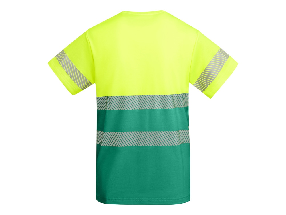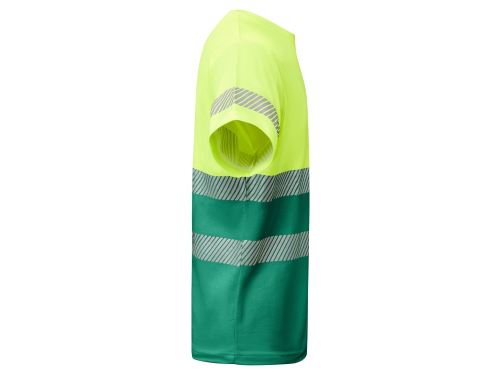 Мужская футболка с коротким рукавом с круглым вырезом под горло из основной ткани. Две светоотражающие сегментированные полосы на груди и одна на рукавах. Микс полиэстера и хлопка для повышенной воздухопроницаемости.