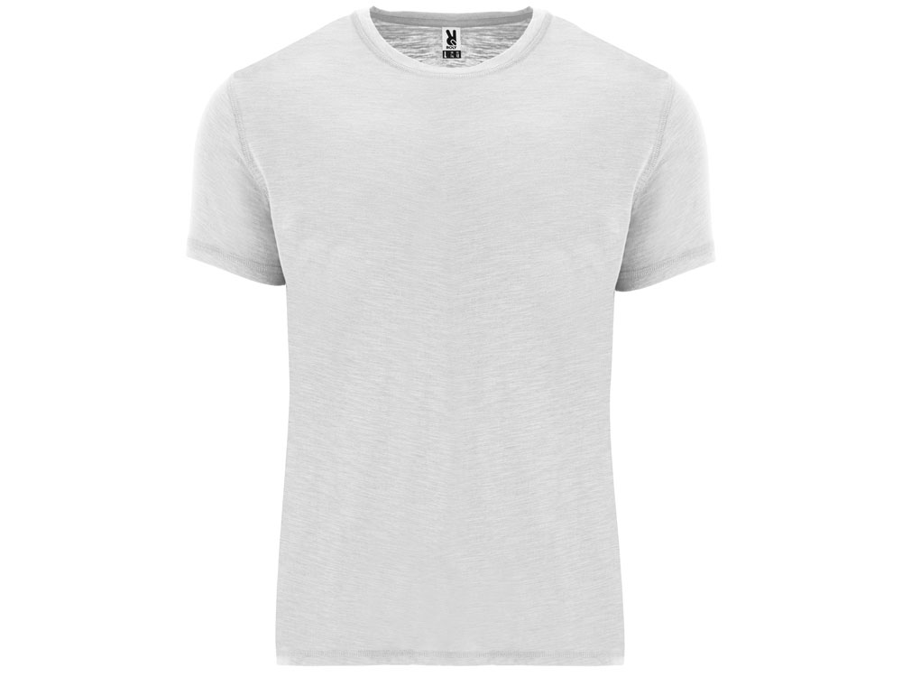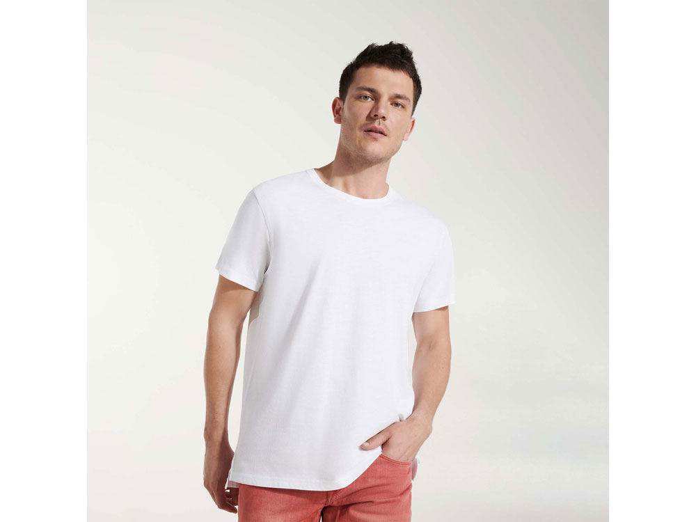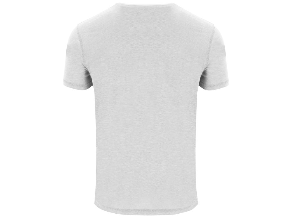 Мужская футболка с коротким рукавом из джерси с протяжками. Горловина отделана тем же полотном и отстрочена плоским швом, дополнительно укреплена тесьмой контрастного цвета. Боковые швы с отстрочкой плоским швом, с разрезом по низу, спинка немного длиннее полочки
