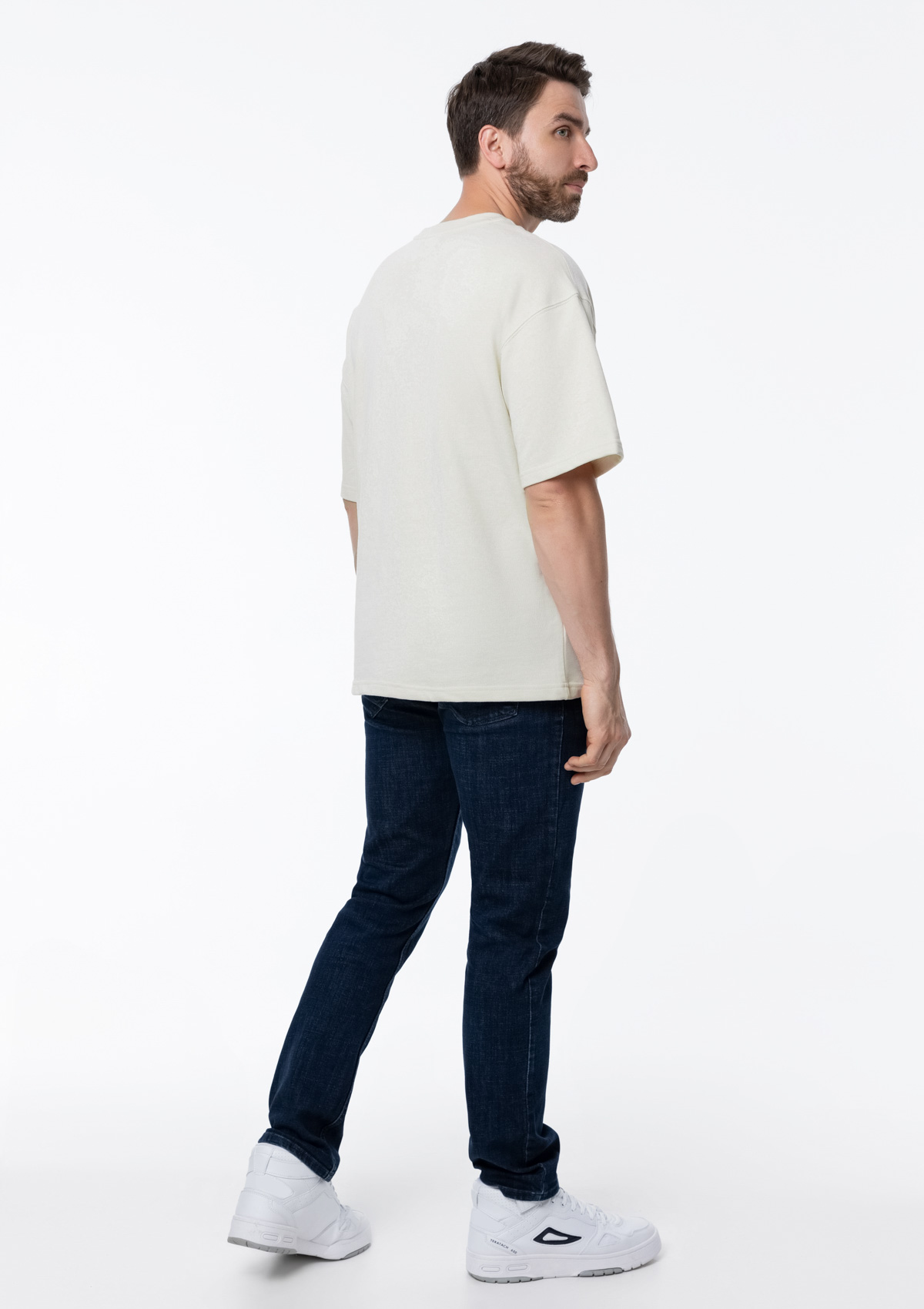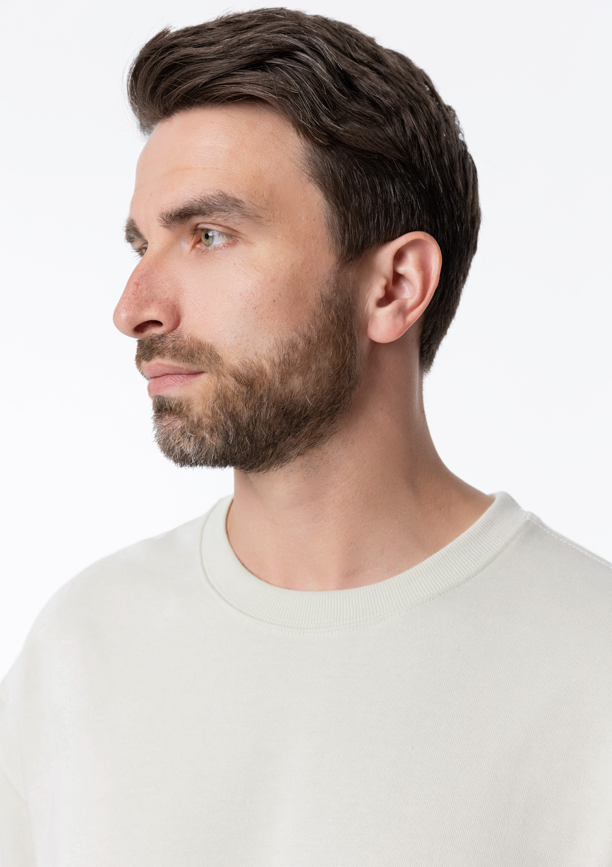 Футболка свободного кроя с округлым воротом и спущенной линией плеча. Шов горловины спинки усилен киперной лентой в тон основному цвету. Универсальная модель идеально впишется как в мужской, так и в женский гардероб.