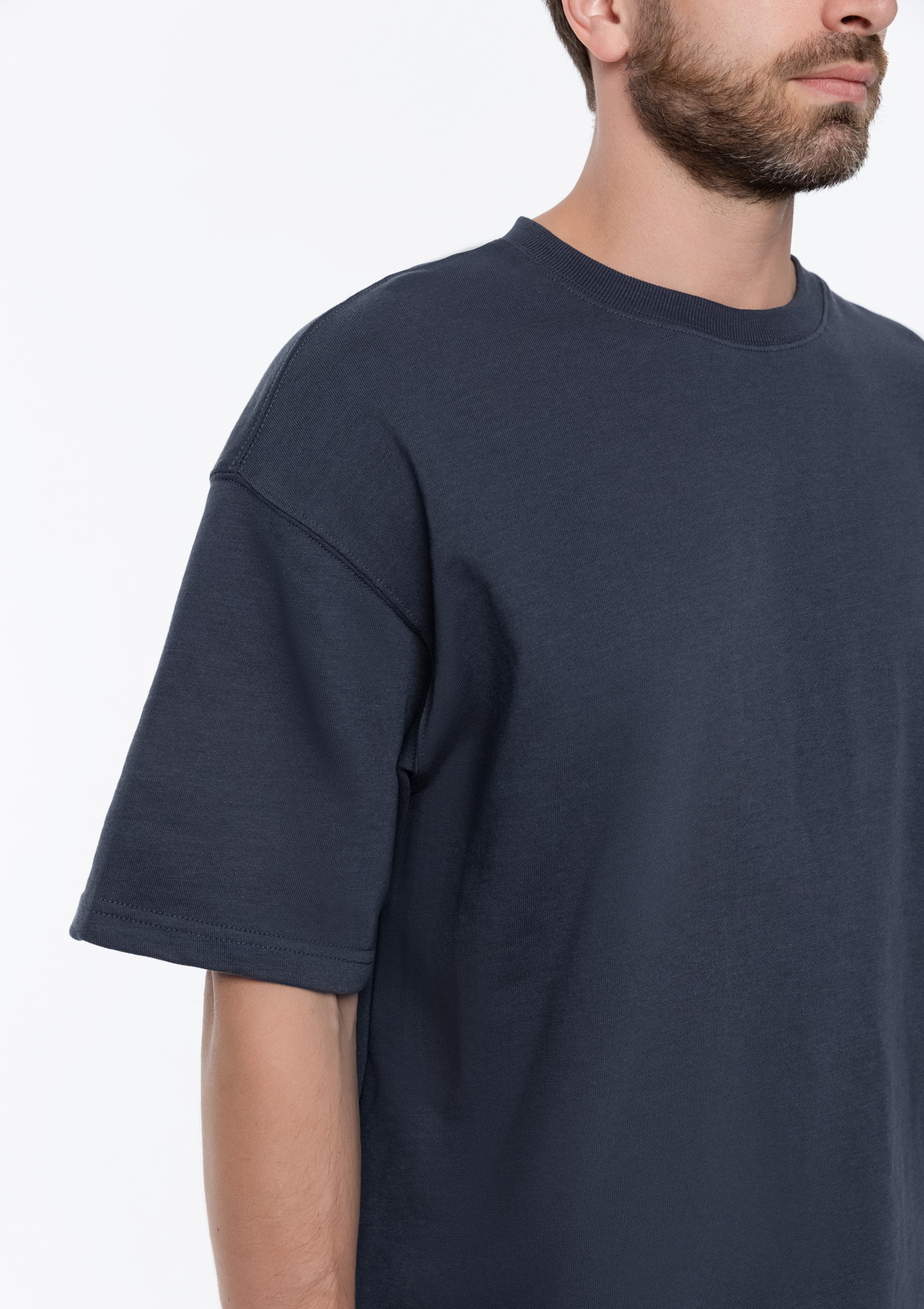 Футболка свободного кроя с округлым воротом и спущенной линией плеча. Шов горловины спинки усилен киперной лентой в тон основному цвету. Универсальная модель идеально впишется как в мужской, так и в женский гардероб.