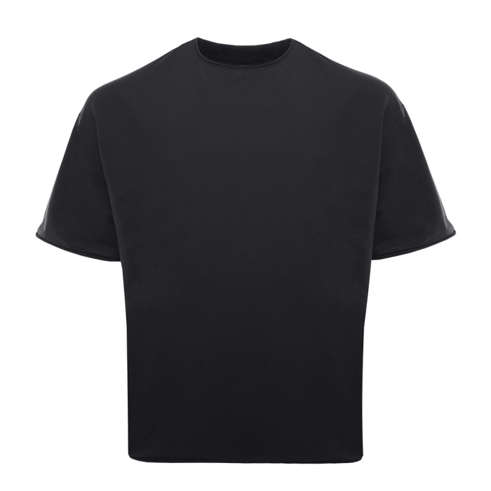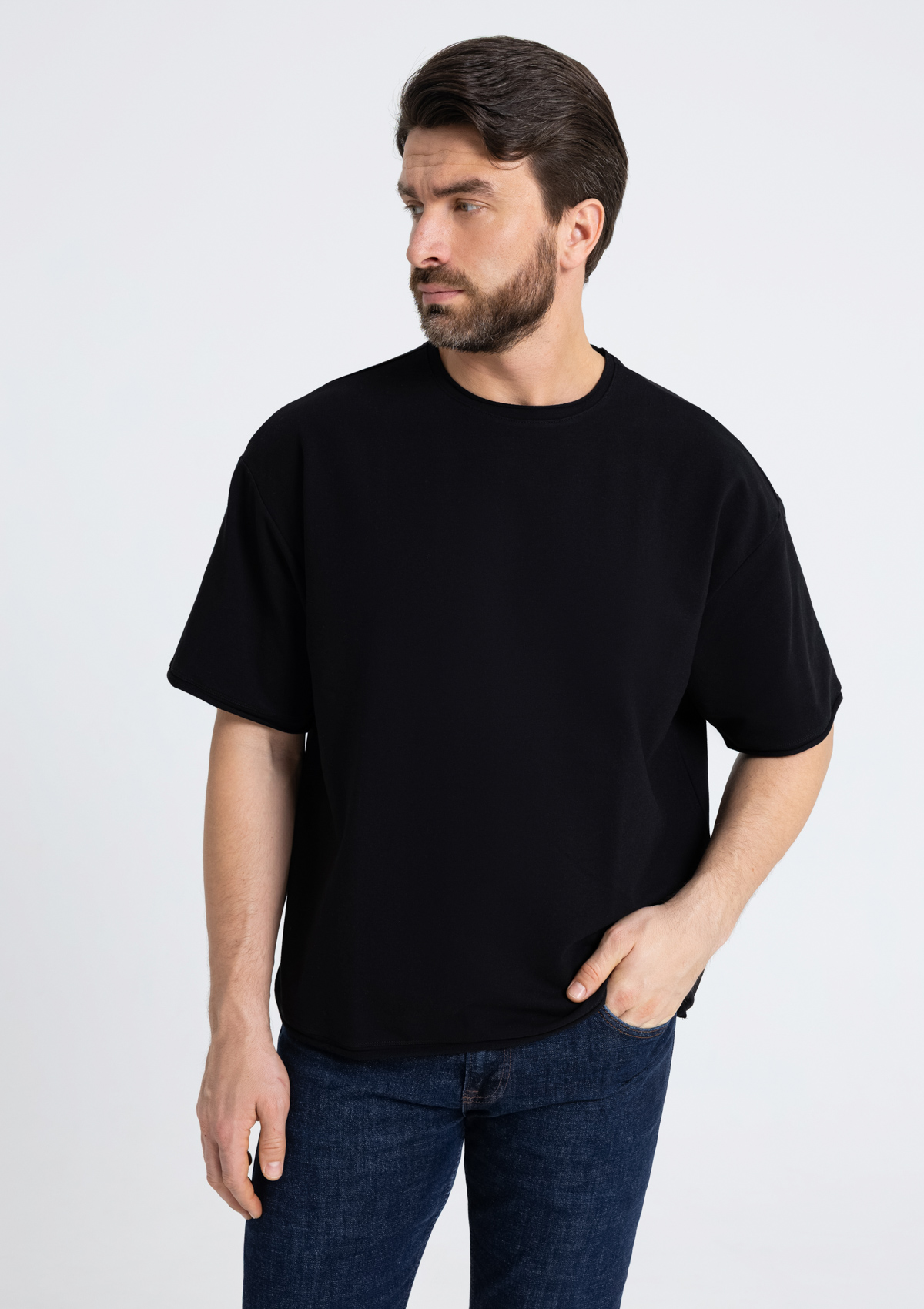 Футболка oversize-силуэта со спущенной линией плеча и необработанным краем рукава, горловины и по низу изделия.