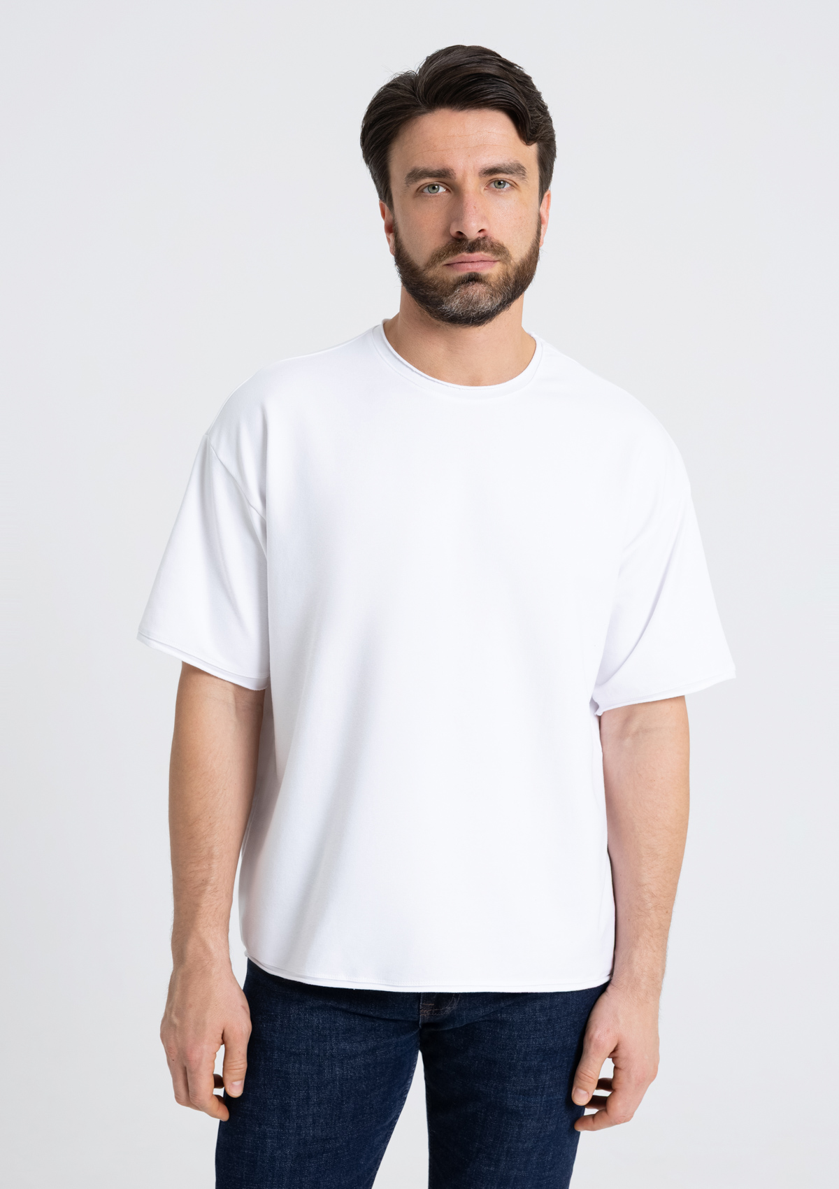 Футболка oversize-силуэта со спущенной линией плеча и необработанным краем рукава, горловины и по низу изделия.