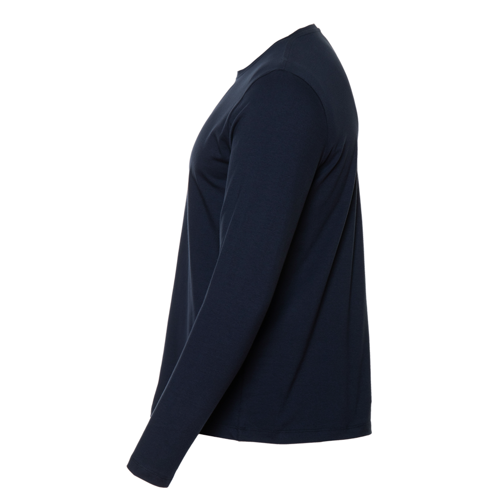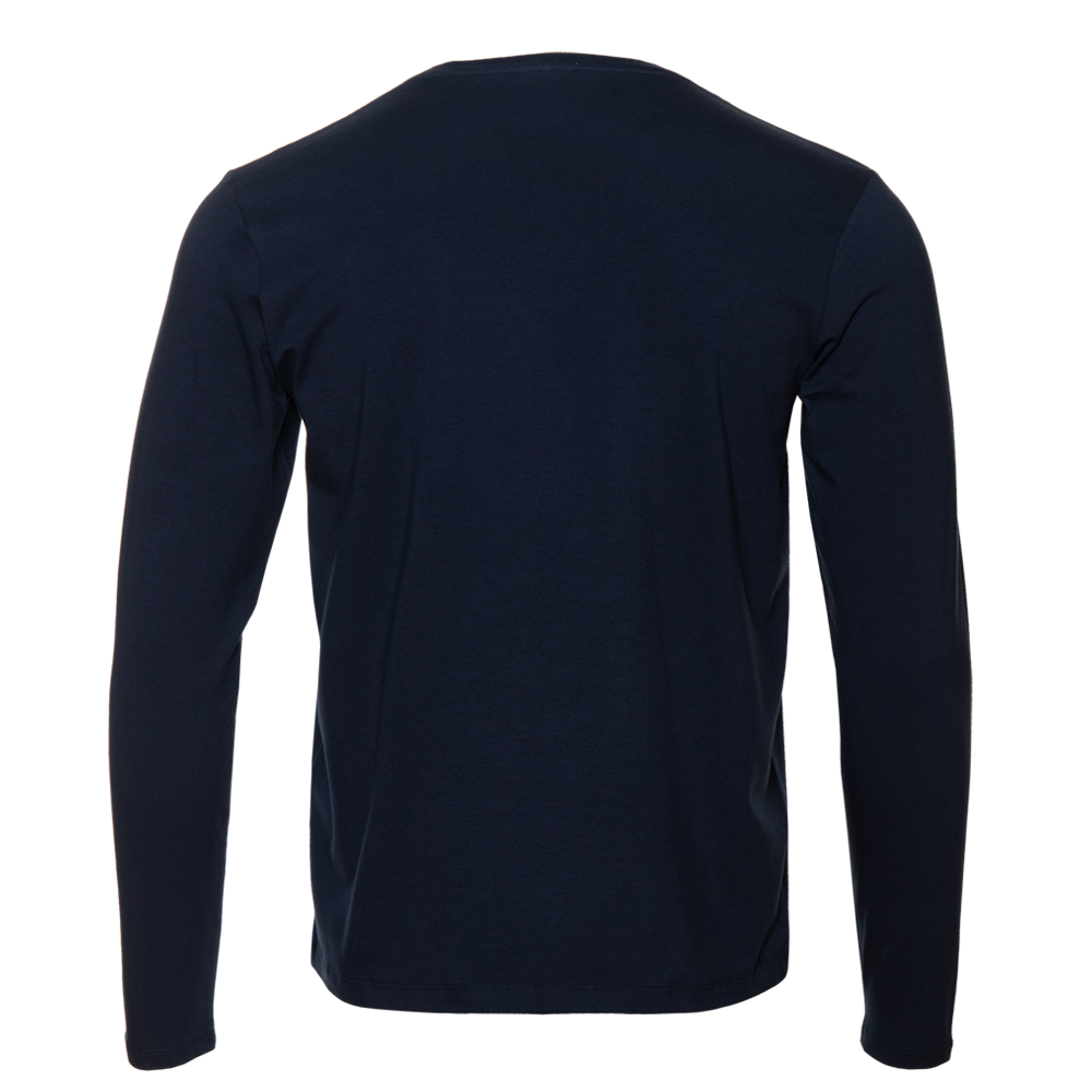 Универсальная футболка прямого силуэта с округлым воротом и длинным втачным рукавом. Плечевые швы и шов горловины усилены настрочной бейкой из основного полотна.