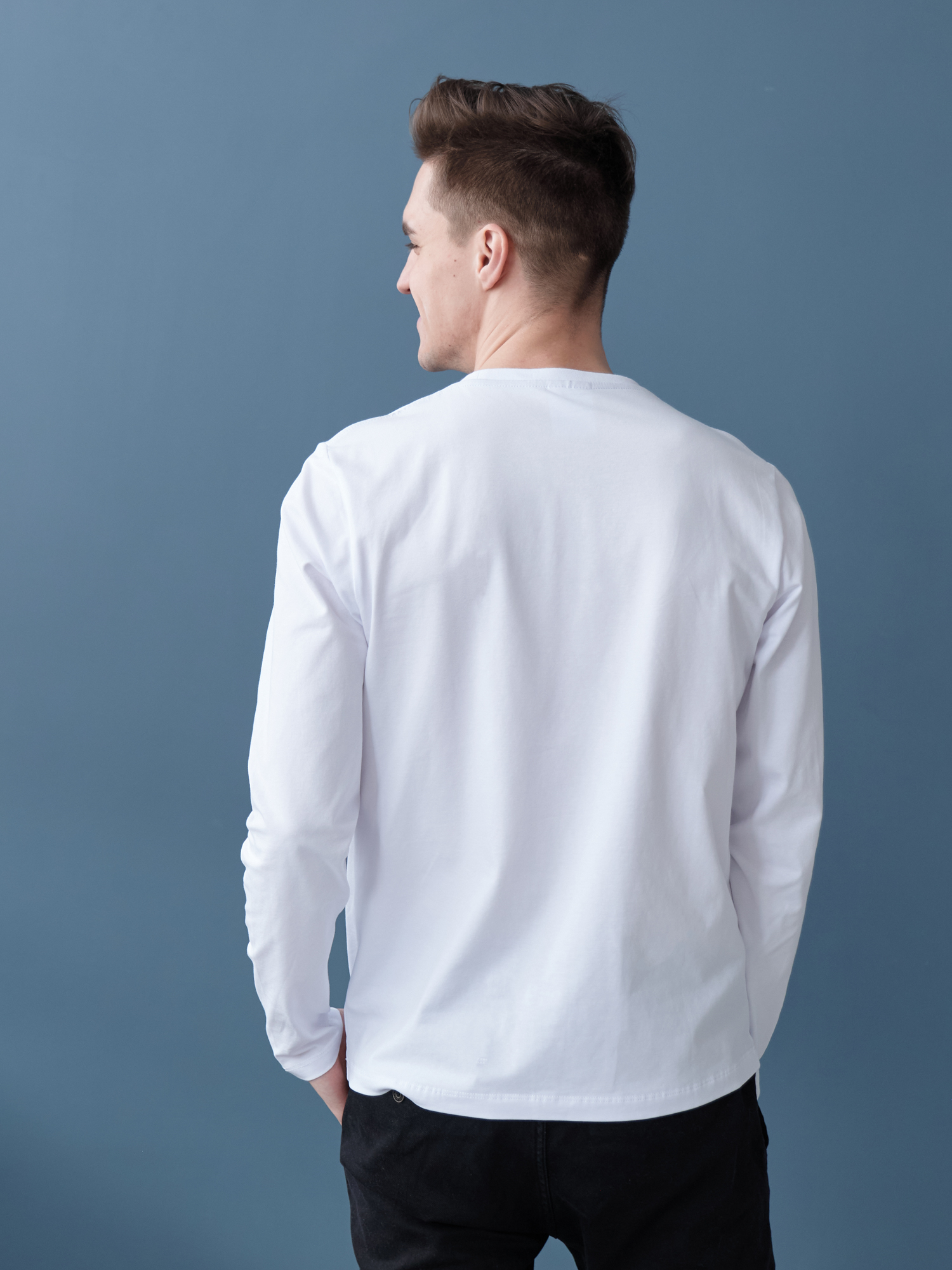 Универсальная футболка прямого силуэта с округлым воротом и длинным втачным рукавом. Плечевые швы и шов горловины усилены настрочной бейкой из основного полотна.