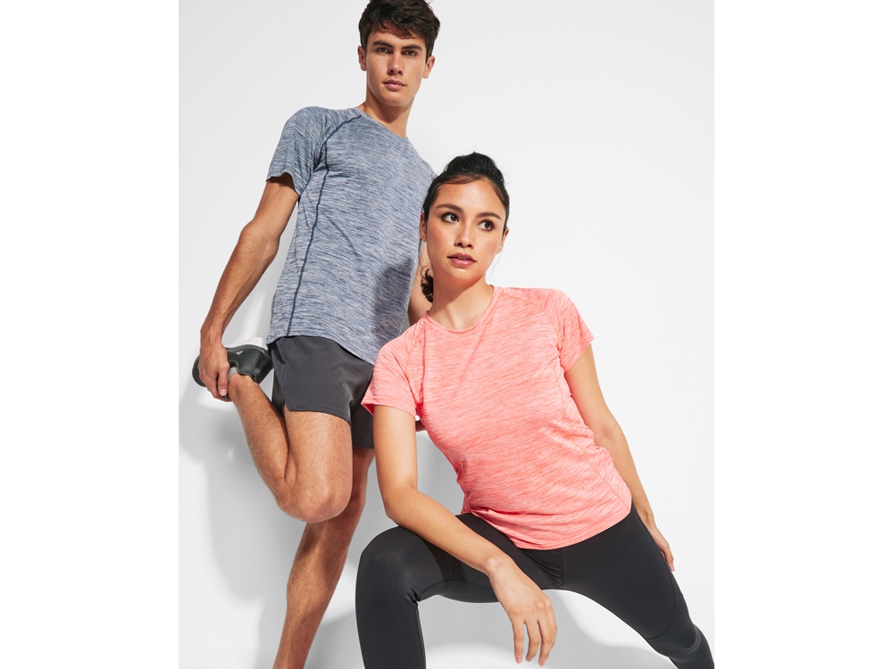 Спортивная футболка из полиэстерового полотна с рукавом реглан. Круглый вырез горловины. Легко сохнущее дышащее полотно с красивым меланжевым эффектом. Прилегающий силуэт.
