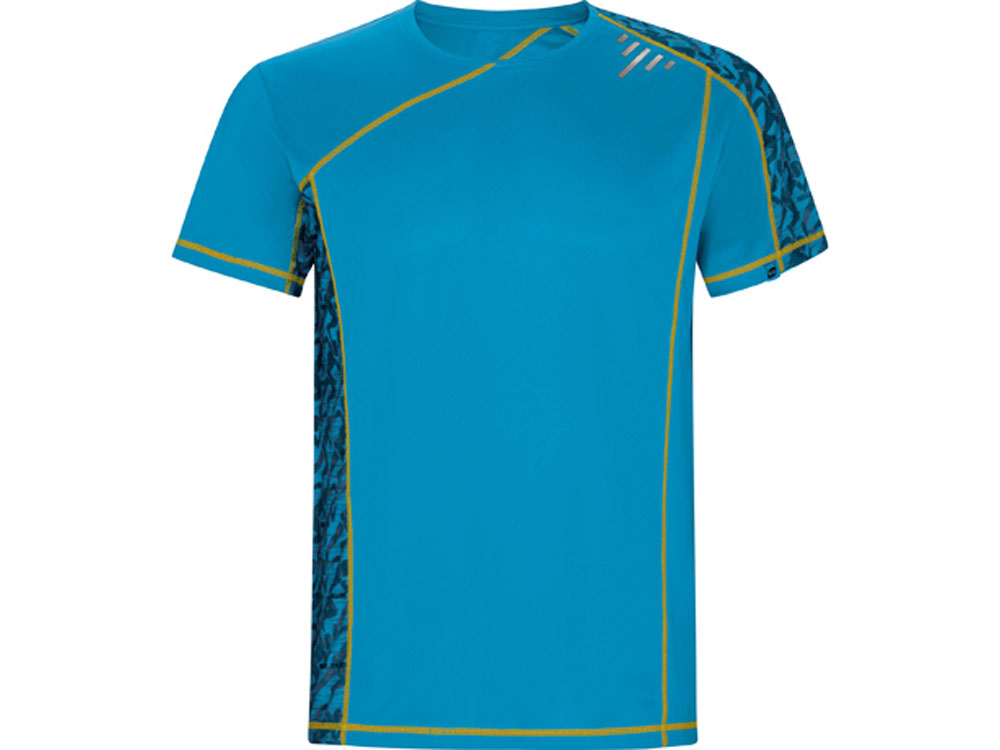 Спортивная футболка с коротким рукавом и принтованными вставками. Контрастные отстрочки плоским швом, светоотражающие элементы на полочке и спинке. Эко лейбл на рукаве.