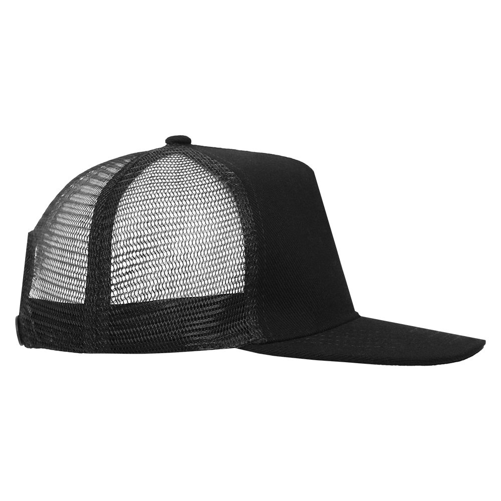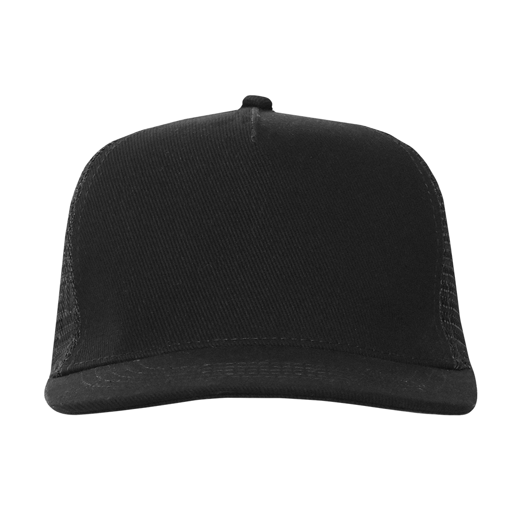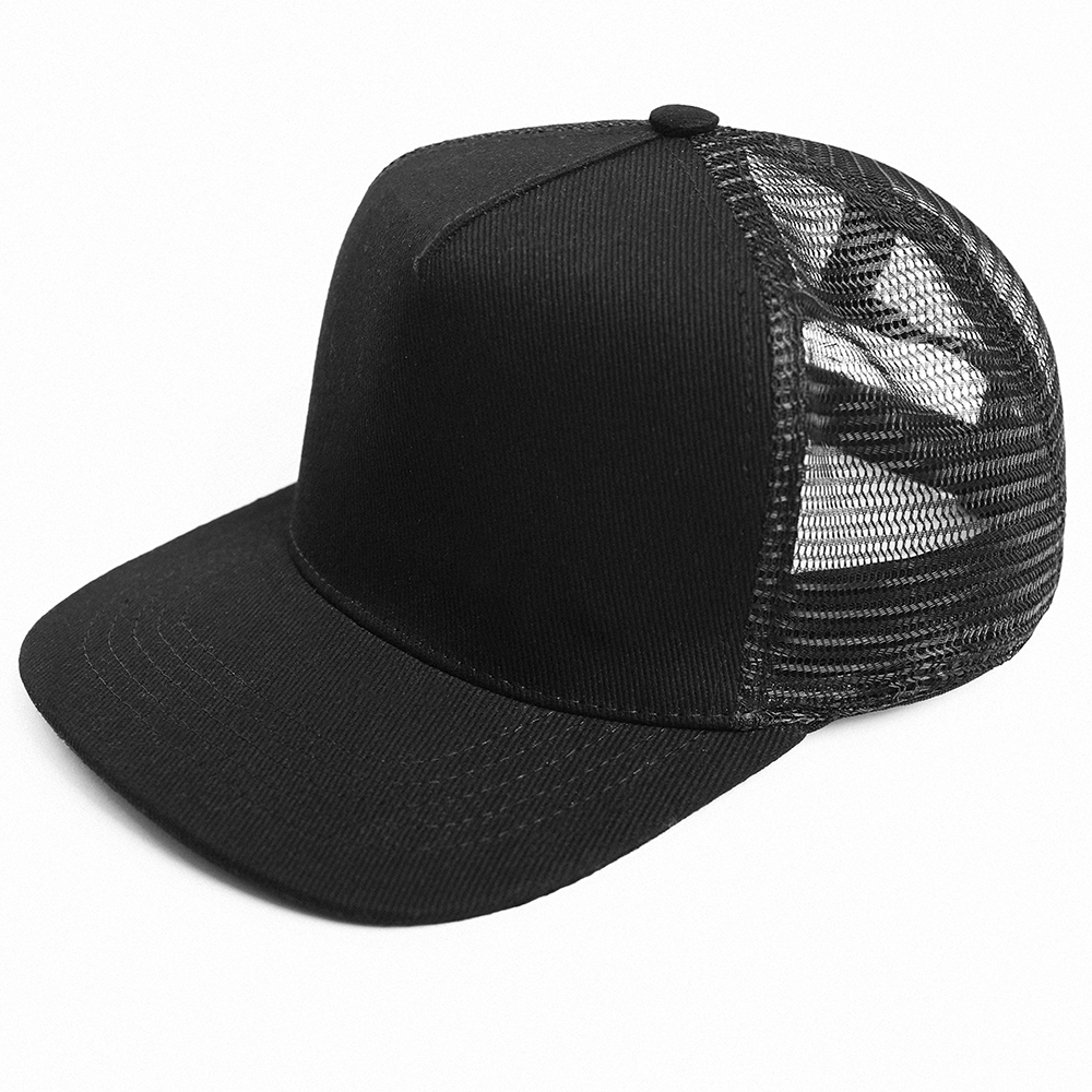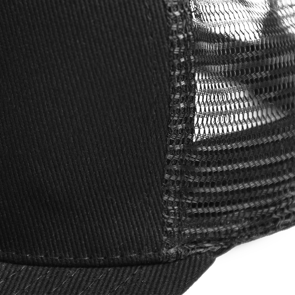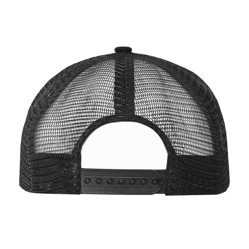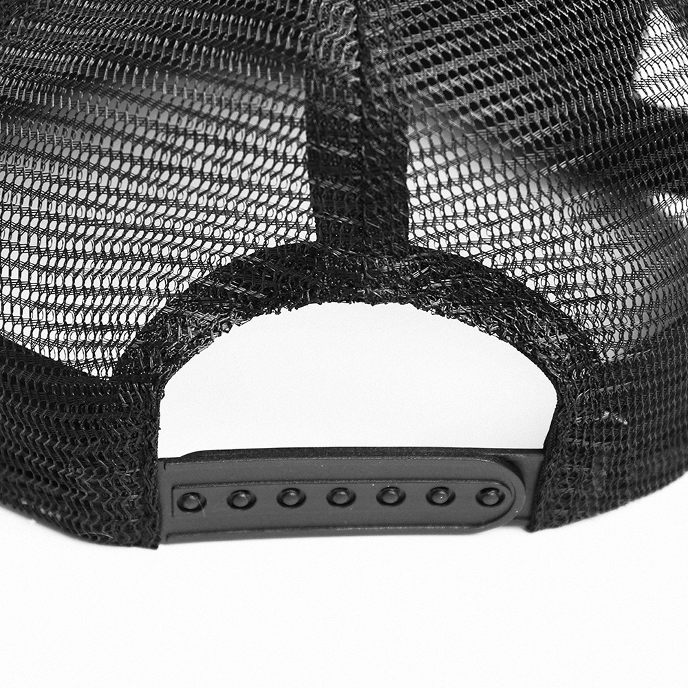 Бейсболка-пятиклинка с прямым жестким козырьком и пластиковой регулируемой застежкой, боковые клинья выполнены из жесткой сетки.