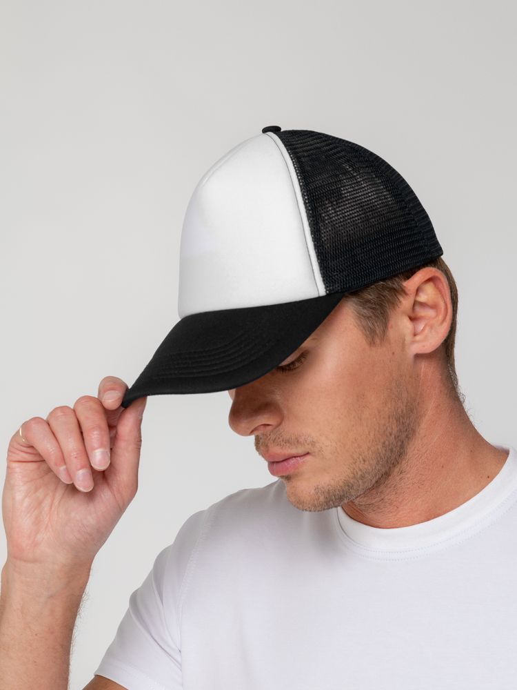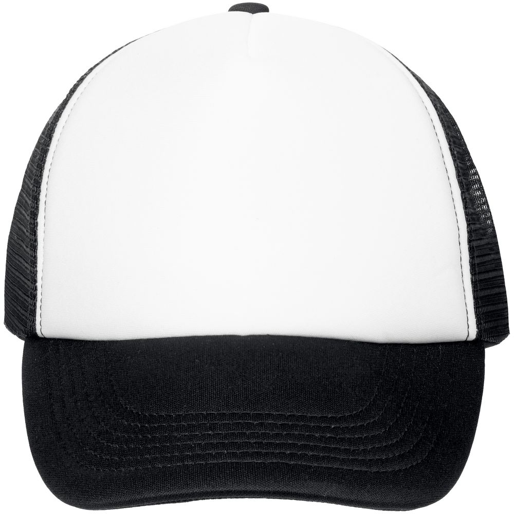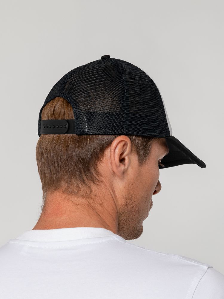 Стандартная модель с 5 клиньями без лобового шва в нестандартном исполнении. Передний клин и козырек выполнены из полиэстера с наполнителем из поролона, боковые и задние клинья — из сетки. Размер регулируется с помощью пластиковой застежки.