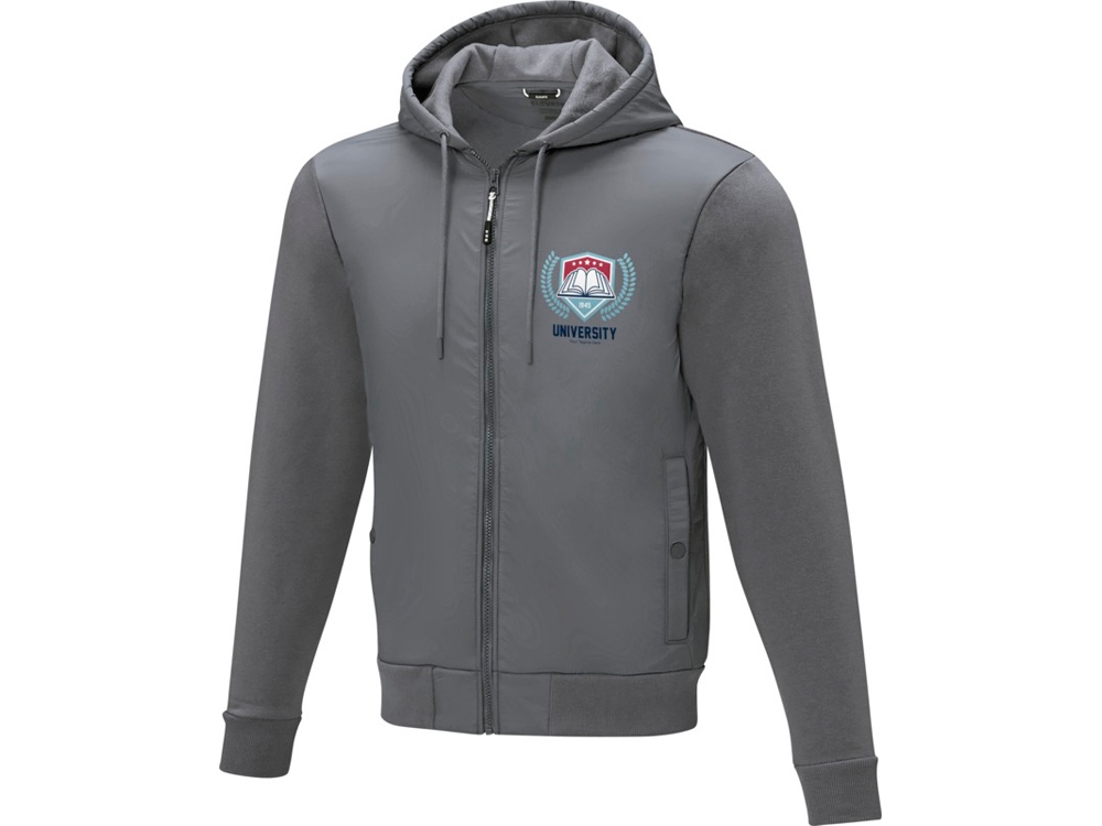 Открытая пластиковая застежка-молния по центру спереди. Карманы спереди. Внутренний карман. Эластичные манжеты и нижний край из гладкого трикотажа. Петля для подвешивания с фирменной символикой. Капюшон на кулиске. Внутренняя сторона покрыта ворсом. Удобный бегунок застежки-молнии. Главный лейбл нанесен методом термоприклеивания, удобным для размещения рисунков на ткани.
